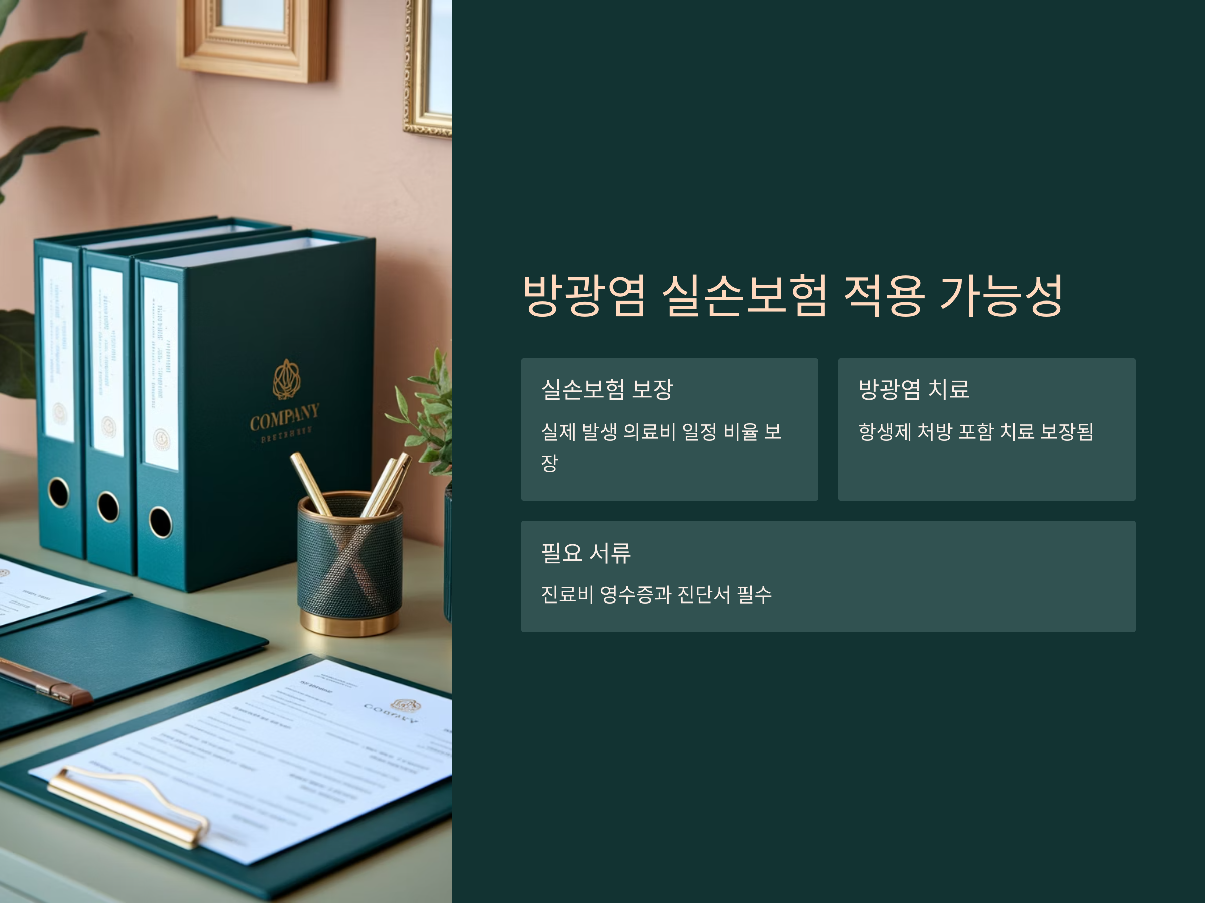 실손보험은 실제로 발생한 의료비에 대해 일정 비율을 보장해주는 보험입니다. 일반적으로 병원에 방문하여 진료를 받은 후, 치료비용의 일부를 보험사가 보상해주는 형태입니다. 방광염 치료는 일반적으로 항생제 처방을 포함한 치료가 필요하며, 실손보험이 적용됩니다. 실손보험 적용을 받기 위해서는 진료비 영수증과 진단서를 제출해야 합니다. 또한, 방광염이 특정 질병군에 포함되지 않기 때문에 특별한 제한 없이 대부분의 실손보험에서 보장 가능합니다.