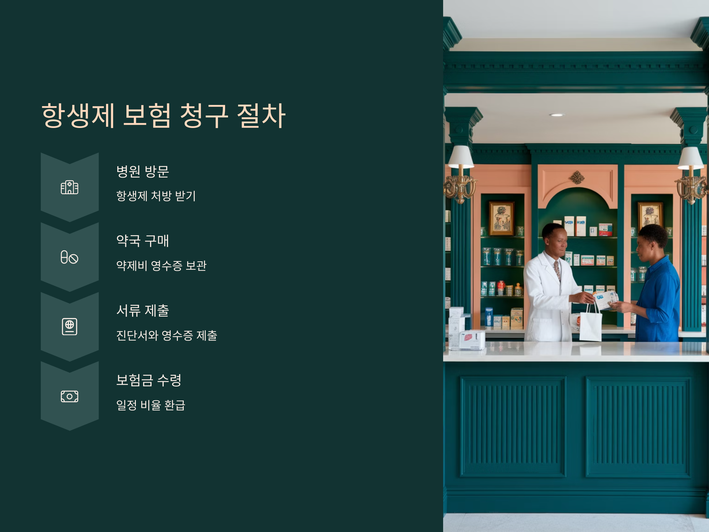 보험 청구를 위해서는 병원에서 항생제 처방을 받은 후, 약국에서 약을 구매하고 그 영수증을 제출해야 합니다. 대부분의 보험사는 약제비에 대해서도 일정 비율을 보상해 주기 때문에, 약제비 영수증도 필수적으로 제출해야 합니다. 청구 서류에는 치료를 받았다는 진단서와 약제 영수증, 치료비 영수증 등이 포함되어야 합니다. 이를 통해 실손보험 회사가 약제비에 대해 일정 비율을 환급해 주게 됩니다.