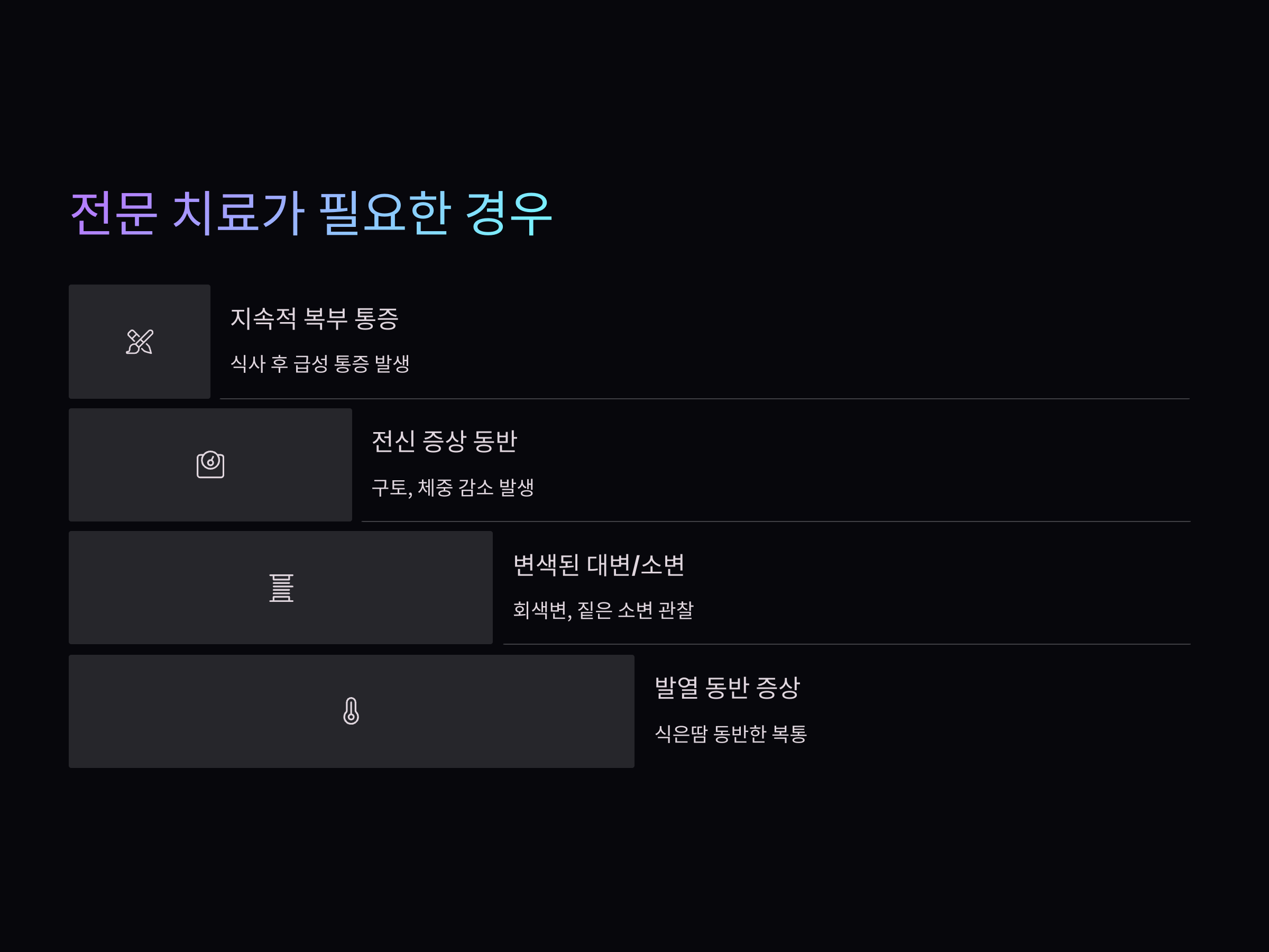 - 구토, 체중 감소 등의 전신 증상 동반