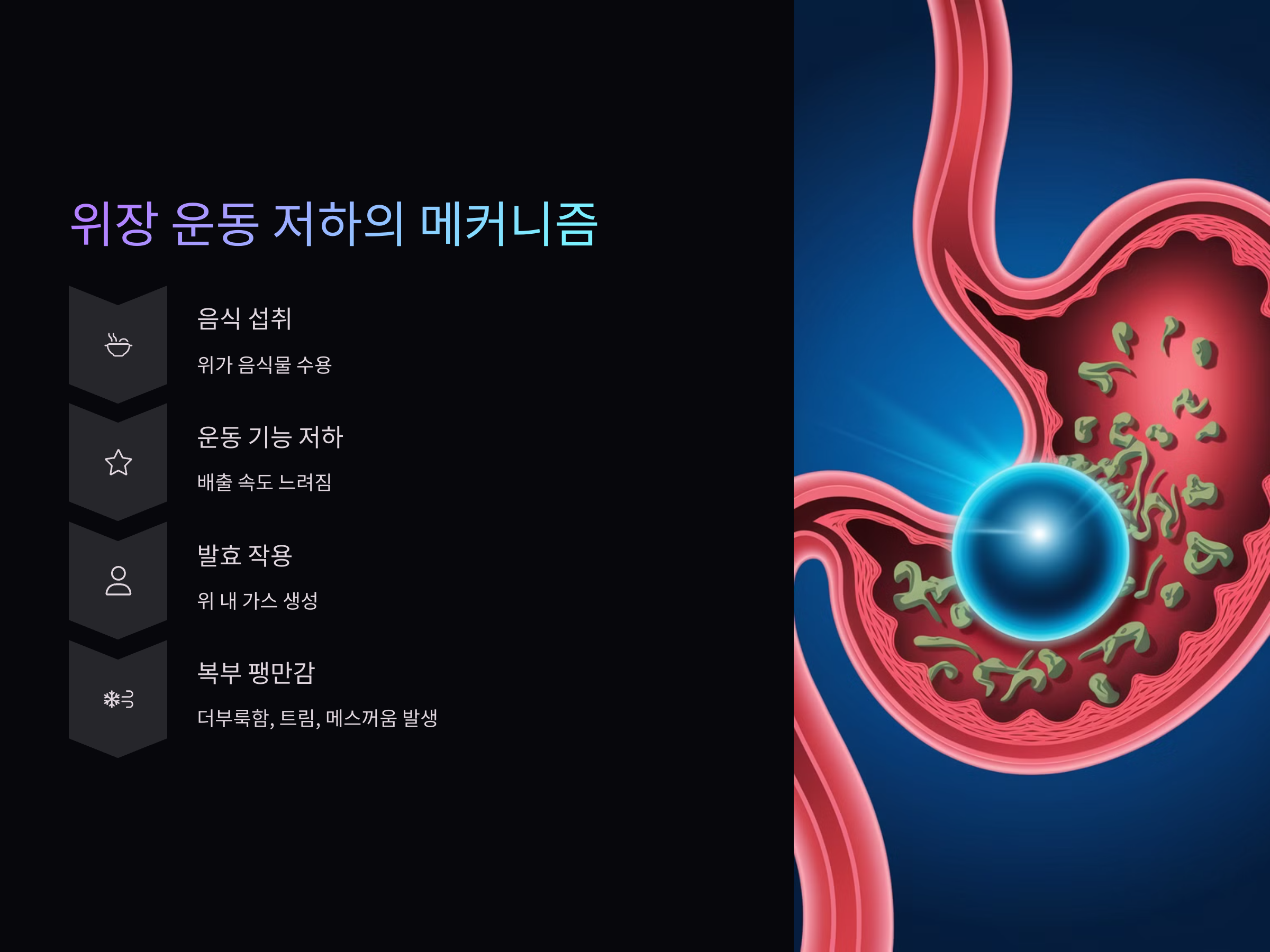 위는 음식물을 수용하고 일정량씩 십이지장으로 내려보내는 역할을 합니다. 이때 위장의 운동 기능이 저하되면 음식물의 배출 속도가 느려지고, 소화과정이 지연됩니다. 이는 위 내에서 발효 작용이 활발해지며 가스를 생성하고, 결과적으로 복부 팽만감으로 이어집니다.