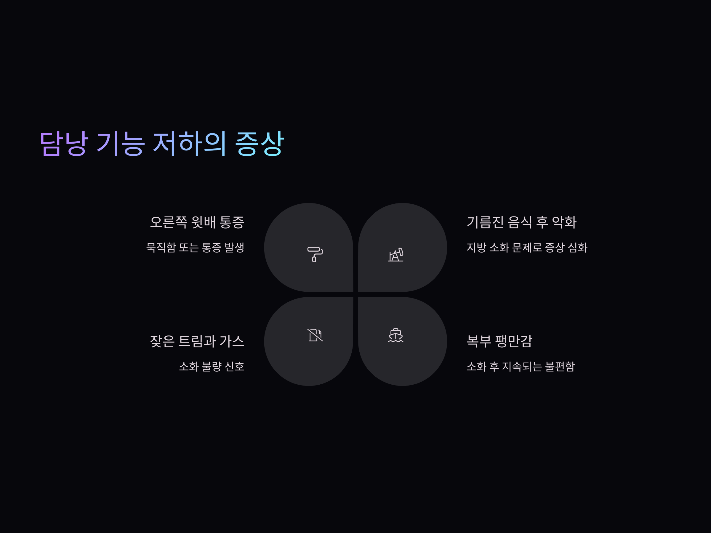 담낭은 음식물, 특히 지방을 소화하기 위해 담즙을 분비하는 기관입니다. 이 기능에 문제가 생기면 지방분해가 제대로 이루어지지 않고 소화가 지연되어 복부 팽만감이 발생할 수 있습니다. 특히 고지방 식사를 할 경우 증상이 더욱 두드러지게 나타납니다.