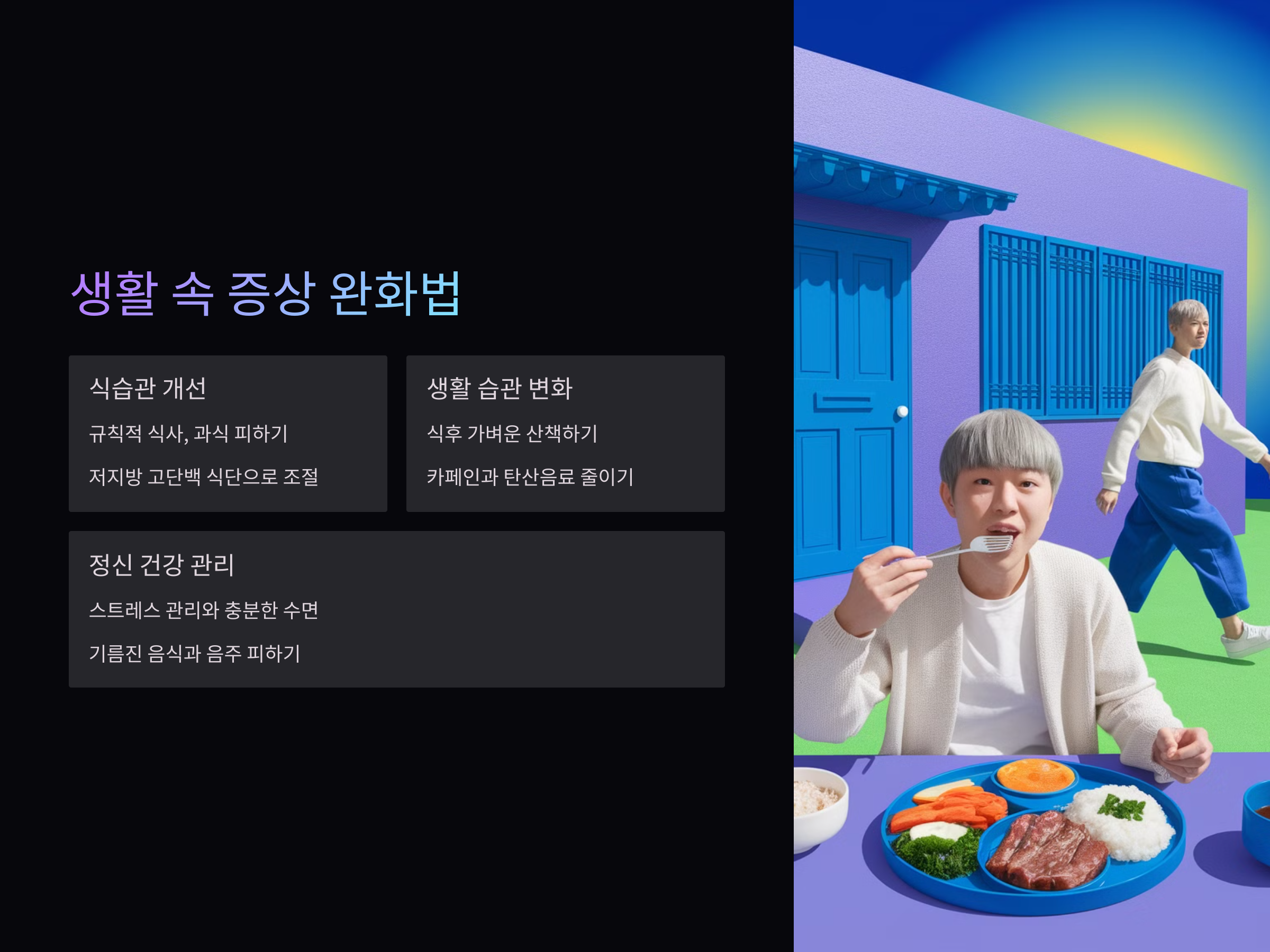 - 식후 바로 눕지 않고 가볍게 산책하기