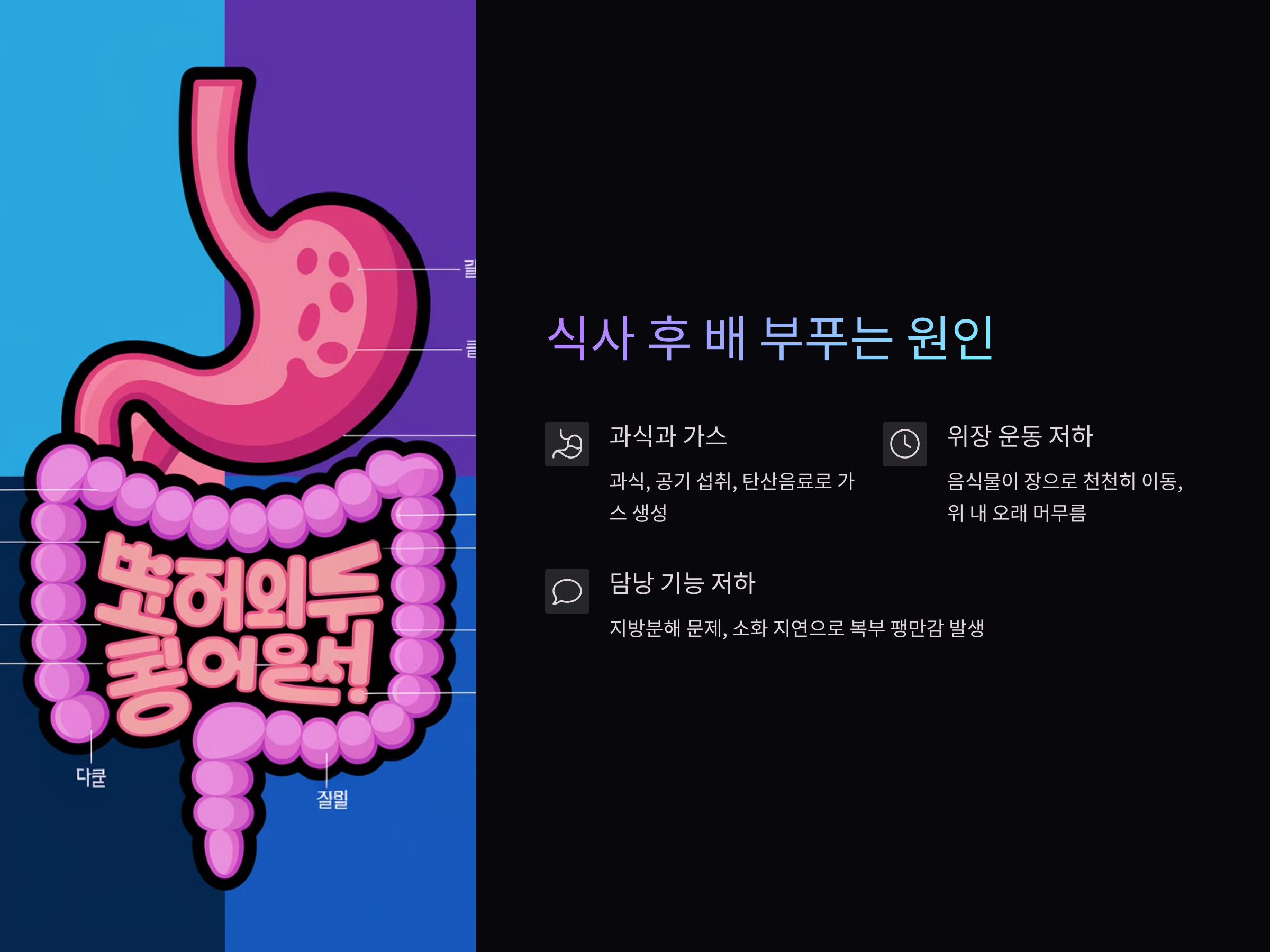 - 고섬유질 음식 후 더부룩함이 심하다면 위장 운동 저하일 가능성이 높습니다.