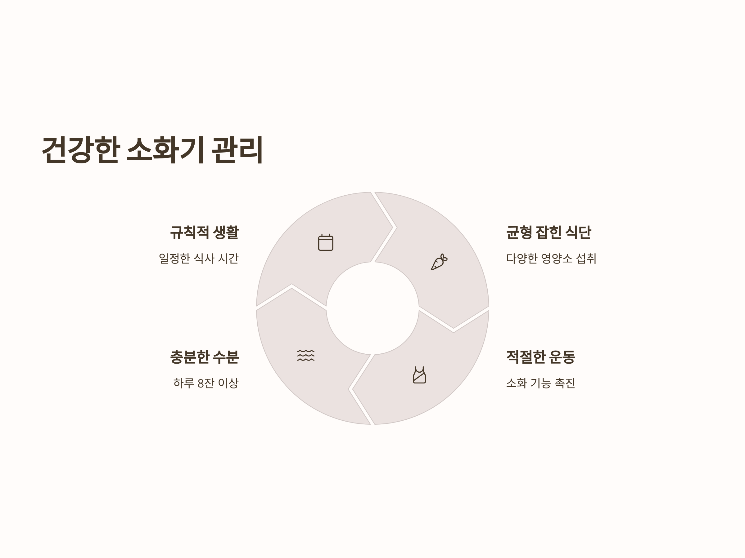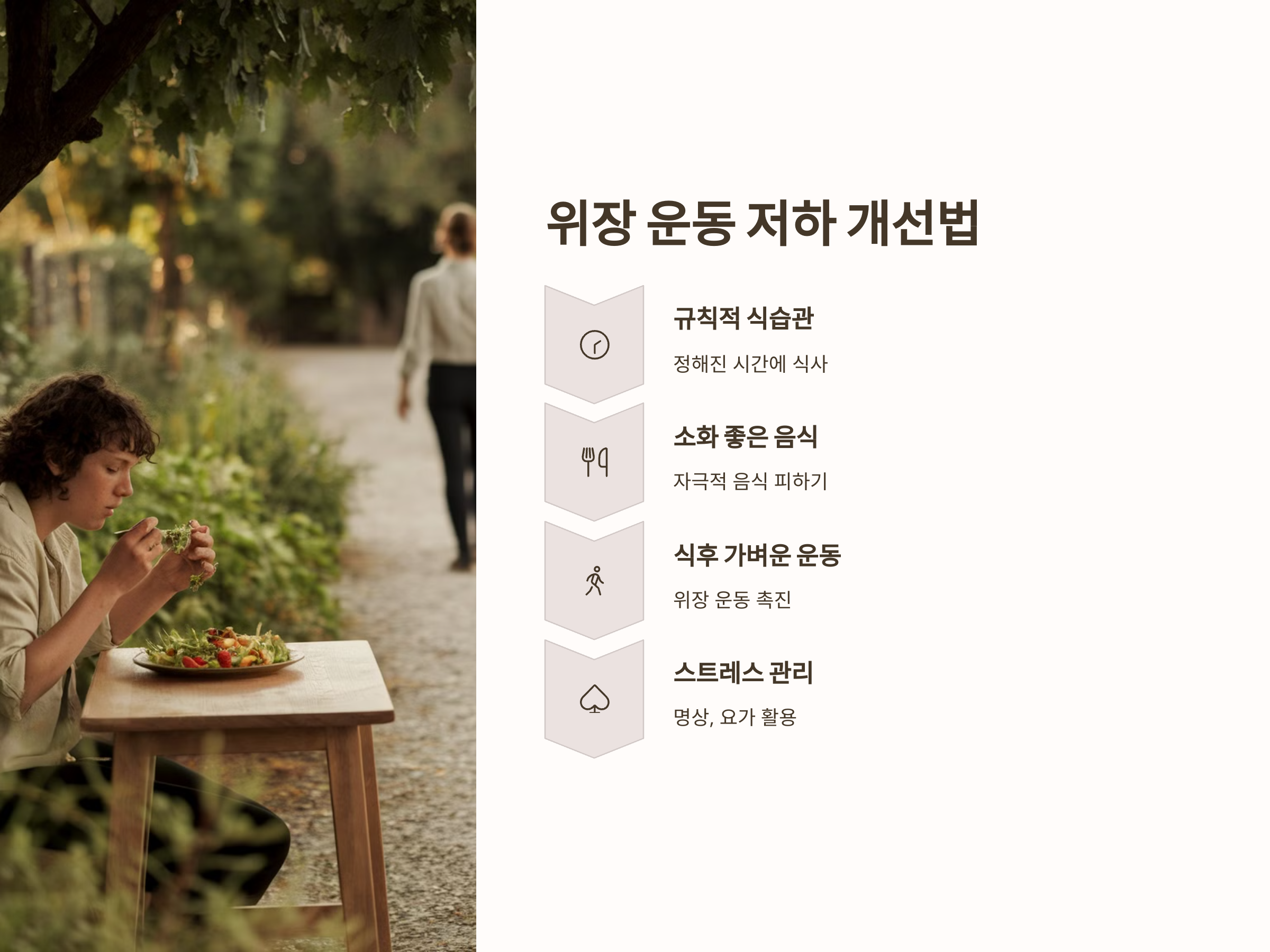 위장 운동 저하를 개선하기 위한 첫 번째 방법은 규칙적인 식습관을 유지하는 것입니다. 식사는 일정한 시간에 하고, 과식이나 급하게 음식을 먹지 않도록 해야 합니다. 또한, 기름진 음식이나 자극적인 음식을 피하고, 소화가 잘 되는 음식을 선택하는 것이 중요합니다. 식사 후에는 가벼운 산책을 하여 위장 운동을 촉진시킬 수 있습니다.