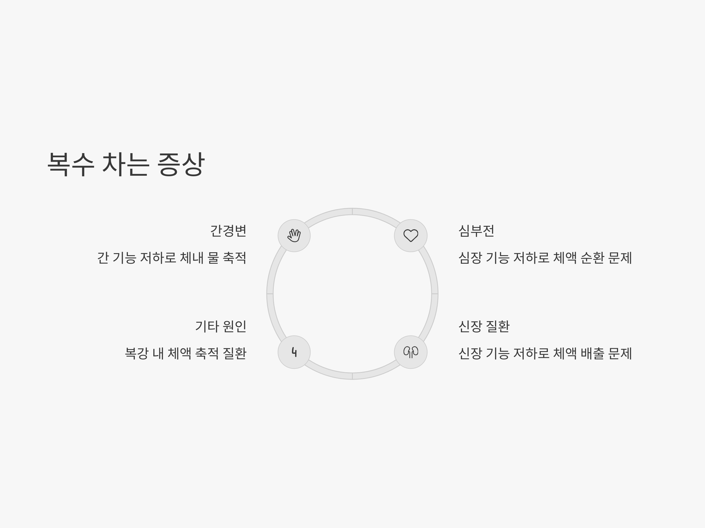 복수가 차는 주요 원인 중 하나는 간경변입니다. 간경변은 간 기능이 저하되어 체내에 물이 축적되는 상태로, 복수 외에도 피로감, 황달, 식욕 부진 등의 증상이 동반될 수 있습니다. 또한 심부전이나 신장 질환도 복수가 찰 수 있는 원인입니다. 복수가 차는 증상은 장운동 저하와 비슷하게 배가 팽창하고 가스가 차는 것처럼 느껴질 수 있지만, 그 원인은 체액의 축적에 있기 때문에 증상이 시간이 지나면서 점차 악화될 수 있습니다.
