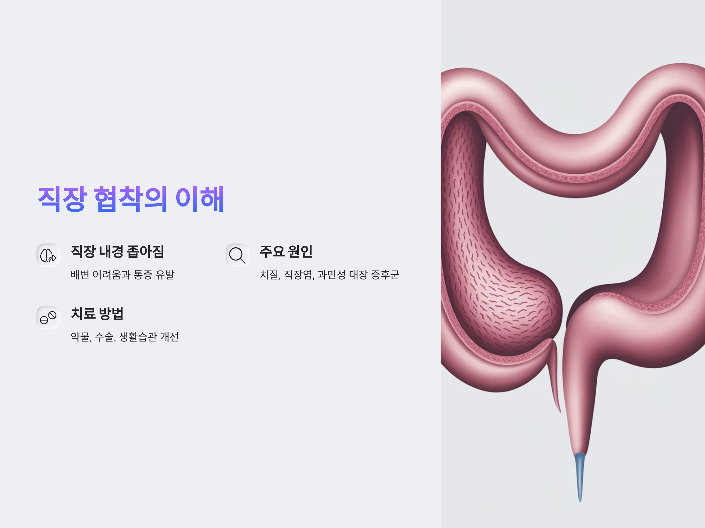 이러한 협착은 배변을 할 때, 특히 대변이 단단하거나 많은 양일 때 더욱 두드러지게 나타날 수 있습니다. 직장 협착은 대부분 비침습적인 치료나 수술로 해결할 수 있으나, 증상이 지속될 경우 장기적인 관리가 필요할 수 있습니다.