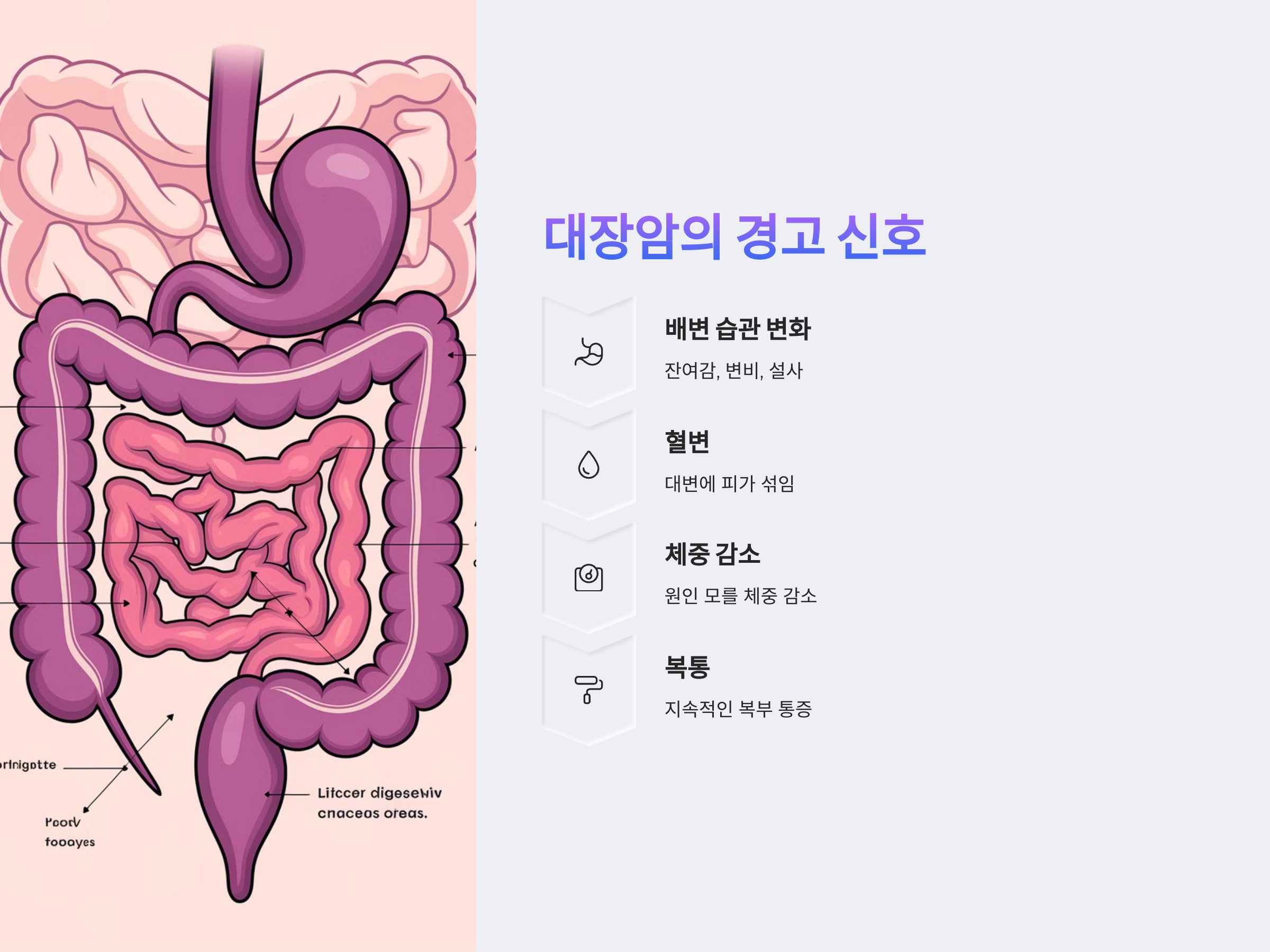 배변 후에도 변이 남아 있는 느낌이 대장암의 초기 증상일 수 있다는 사실을 알고 있나요? 대장암은 일반적으로 배변 습관의 변화, 복통, 체중 감소, 피가 섞인 대변 등과 같은 증상을 동반하지만, 초기에는 증상이 매우 미미할 수 있습니다. 배변 후 잔여감이 지속되거나 배변이 어려워지는 경우, 대장암의 가능성을 의심할 수 있습니다.