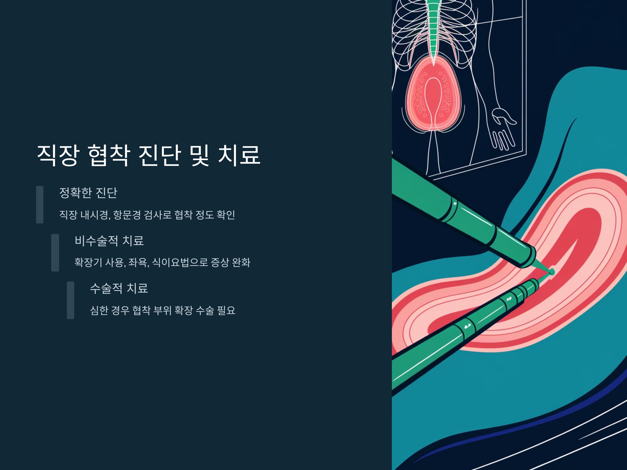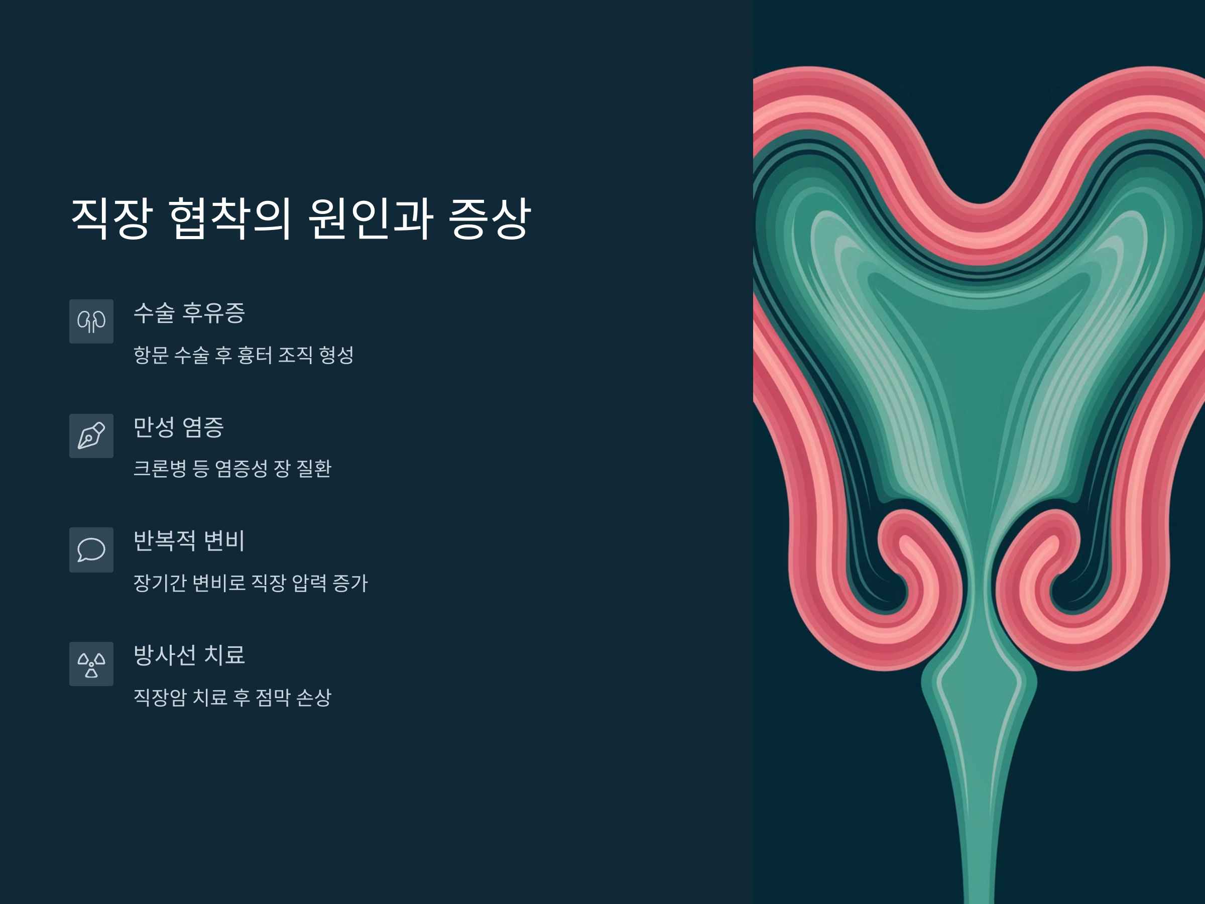 - 수술 후유증: 치질 등의 항문 수술 후 흉터 조직이 형성되어 협착이 생길 수 있습니다.