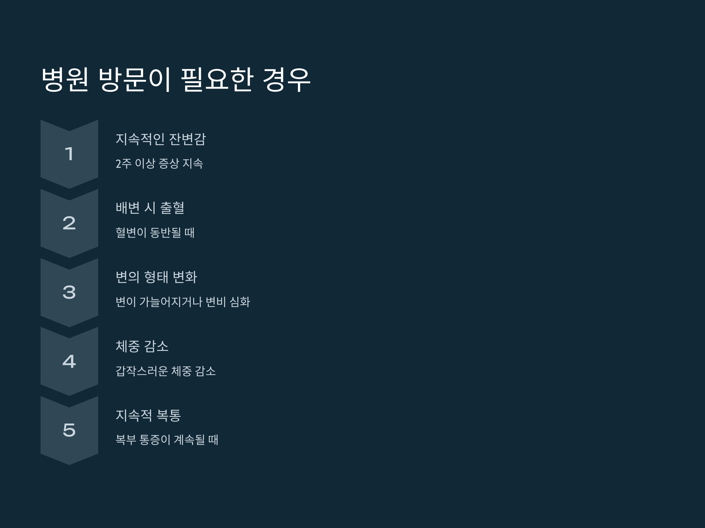 이러한 증상은 대장암, 크론병 등 심각한 질환의 신호일 수 있으므로 주의가 필요합니다.