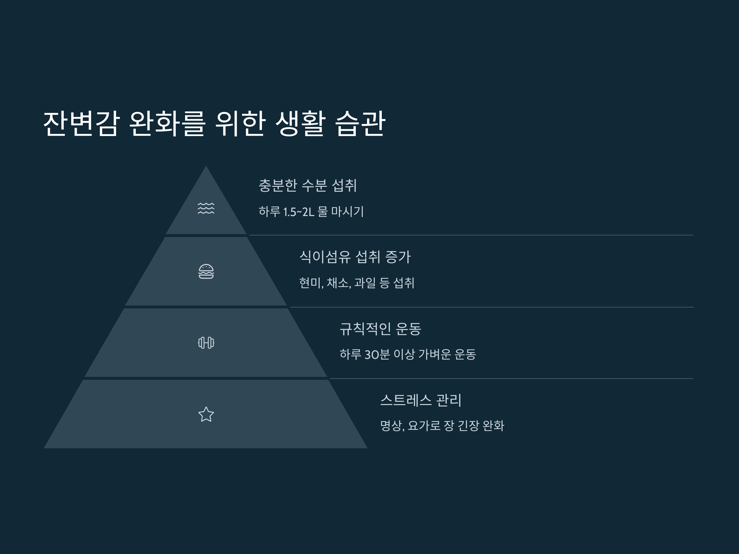 잔변감을 줄이기 위해서는 장 건강을 유지하는 것이 핵심입니다. 다음과 같은 생활 습관을 실천해보세요: