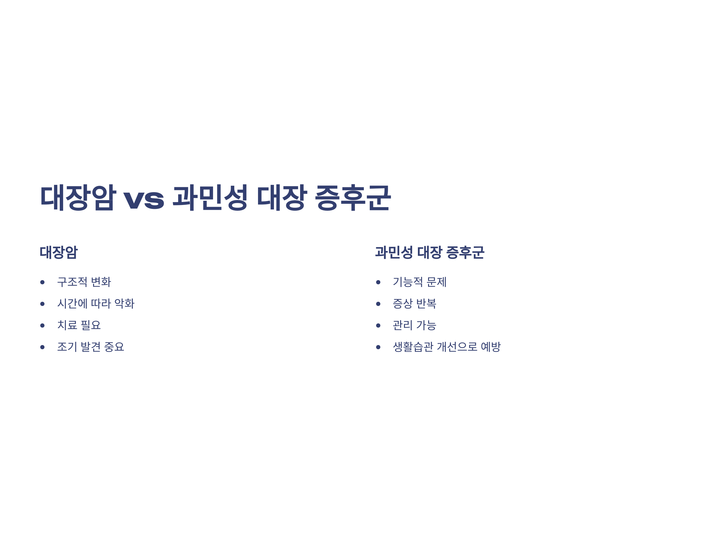 대장암과 과민성 대장 증후군(IBS)은 여러 면에서 유사하지만, 중요한 차이점이 있습니다. 대장암은 장의 구조적 변화로 인해 발생하는 질환이며, 시간이 지남에 따라 증상이 악화될 수 있습니다. 반면, IBS는 기능적인 문제로 인해 발생하며, 주로 장의 운동에 문제가 생겨 복통과 배변 습관 변화가 나타납니다. 대장암은 조기 발견과 치료가 중요한 반면, IBS는 관리와 예방이 가능한 질환입니다.