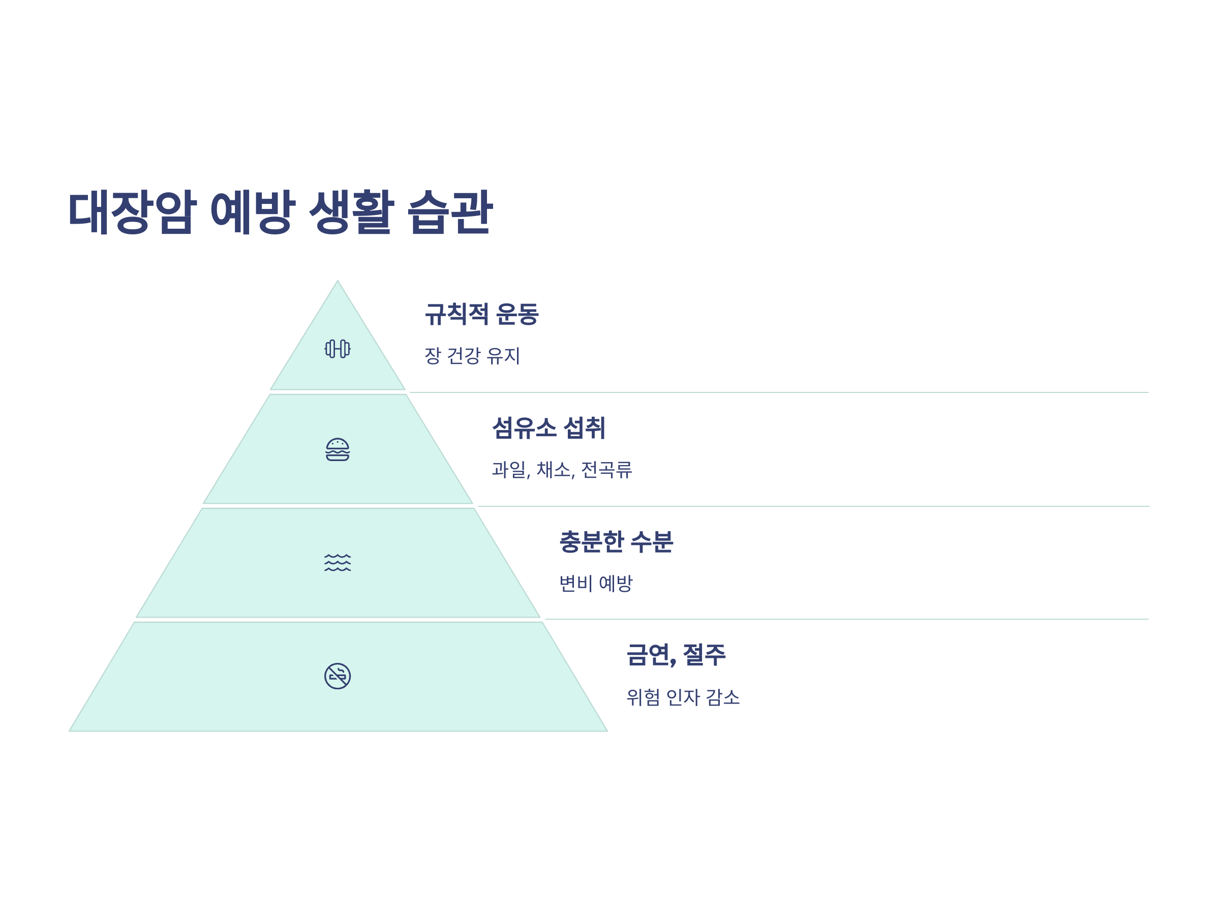 대장암을 예방하기 위해서는 건강한 생활 습관을 유지하는 것이 중요합니다. 운동, 균형 잡힌 식단, 충분한 수분 섭취는 대장 건강을 지키는 데 도움을 줄 수 있습니다. 또한, 규칙적인 배변 습관을 유지하고 과도한 음주나 흡연을 피하는 것이 예방에 효과적입니다. 대장암의 위험 인자를 줄이기 위해서는 섬유소가 풍부한 식사를 하고, 가공육이나 붉은 고기를 피하는 것이 좋습니다.