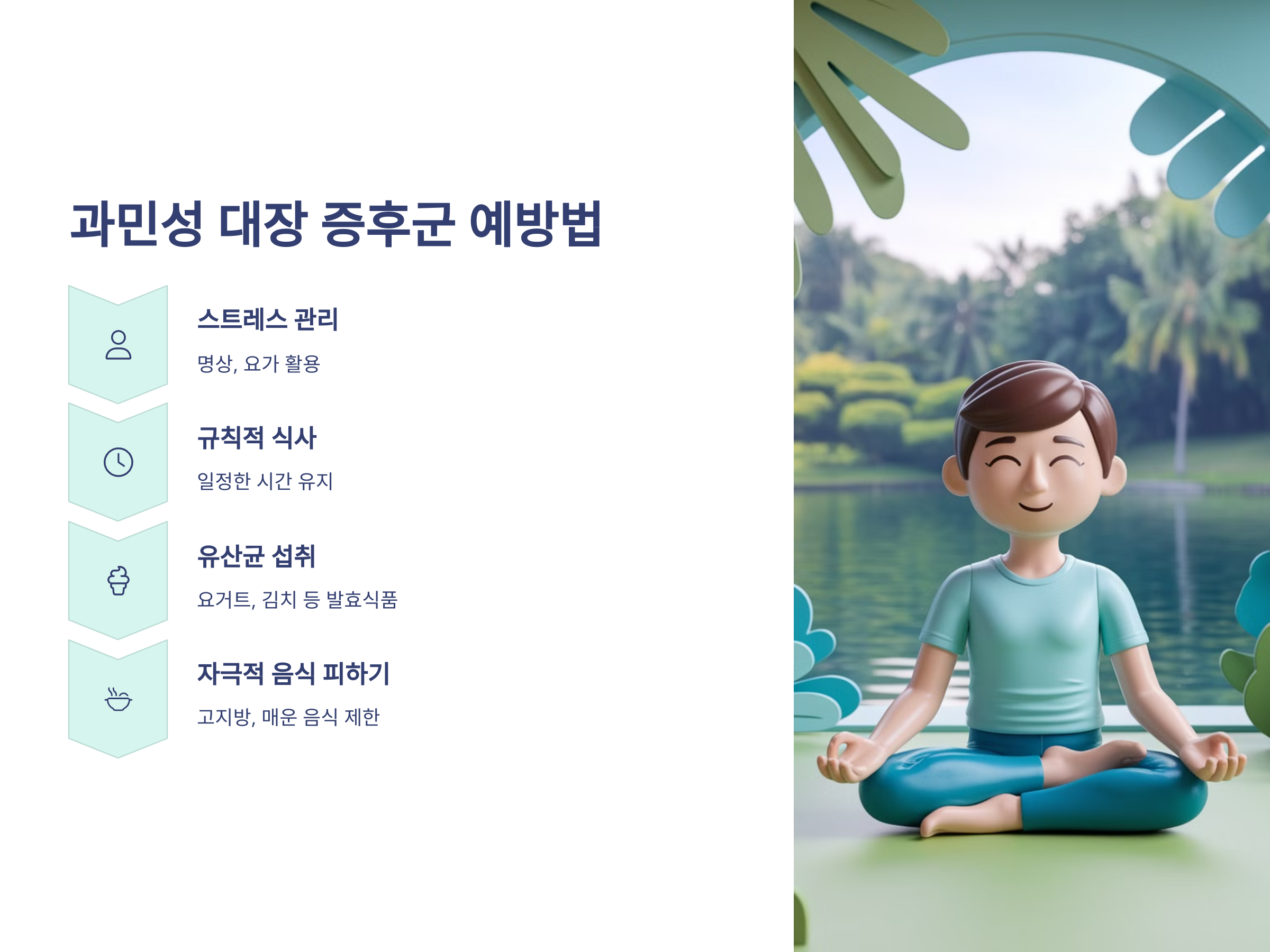 과민성 대장 증후군(IBS)을 예방하기 위해서는 스트레스 관리가 핵심입니다. 스트레스가 IBS 증상을 악화시킬 수 있기 때문에, 명상이나 요가, 규칙적인 운동을 통해 스트레스를 관리하는 것이 중요합니다. 또한, 자극적인 음식이나 고지방 음식을 피하고, 규칙적인 식사를 유지하는 것도 IBS 예방에 도움이 됩니다. 적절한 수분 섭취와 균형 잡힌 식사는 장의 건강을 유지하는 데 큰 역할을 합니다.