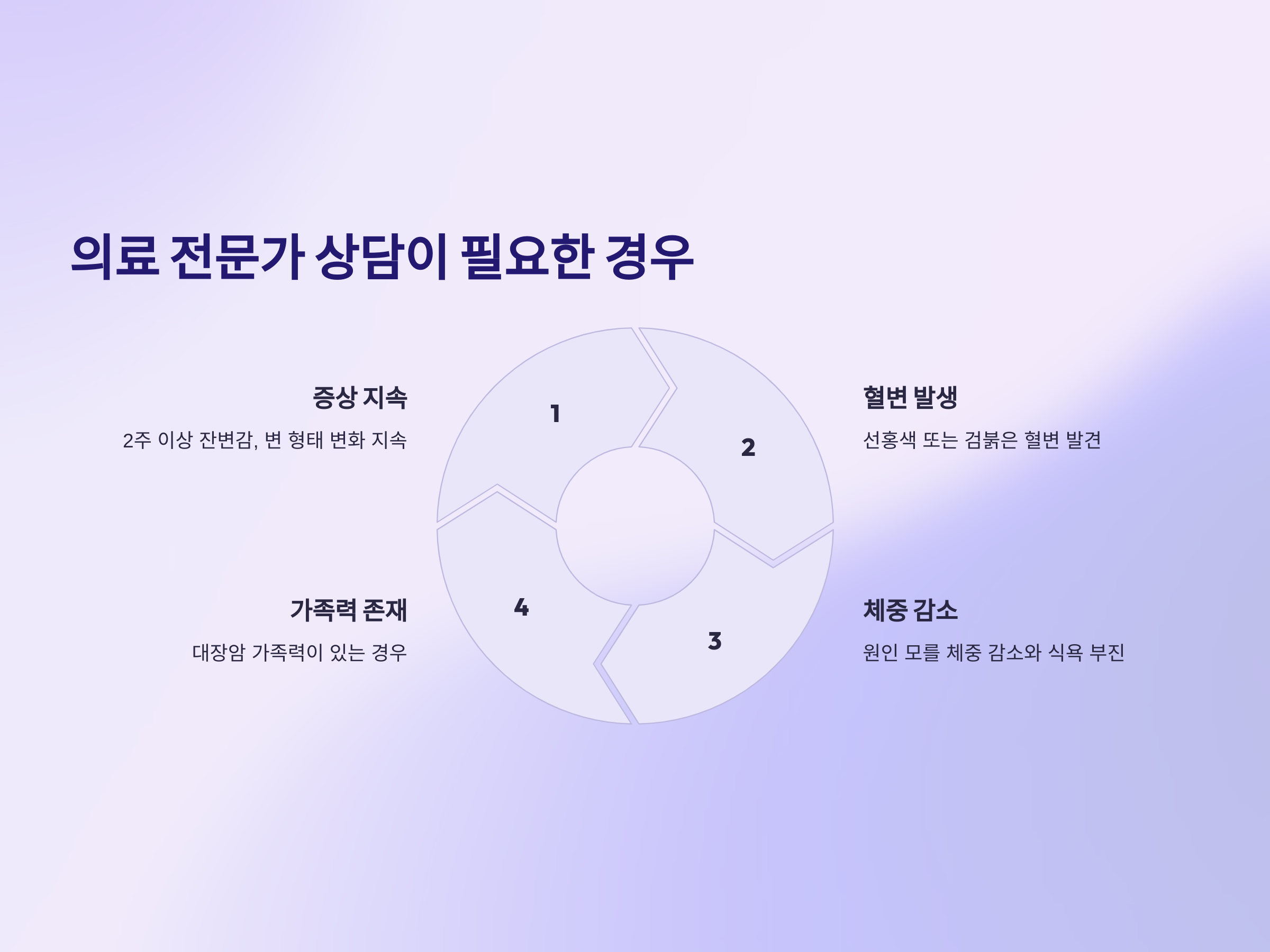 - 복부 불편감: 복통, 복부 팽만감, 잔변감 등이 지속되는 경우