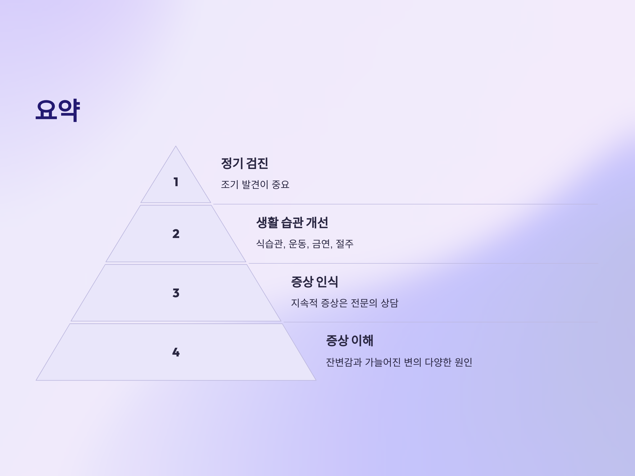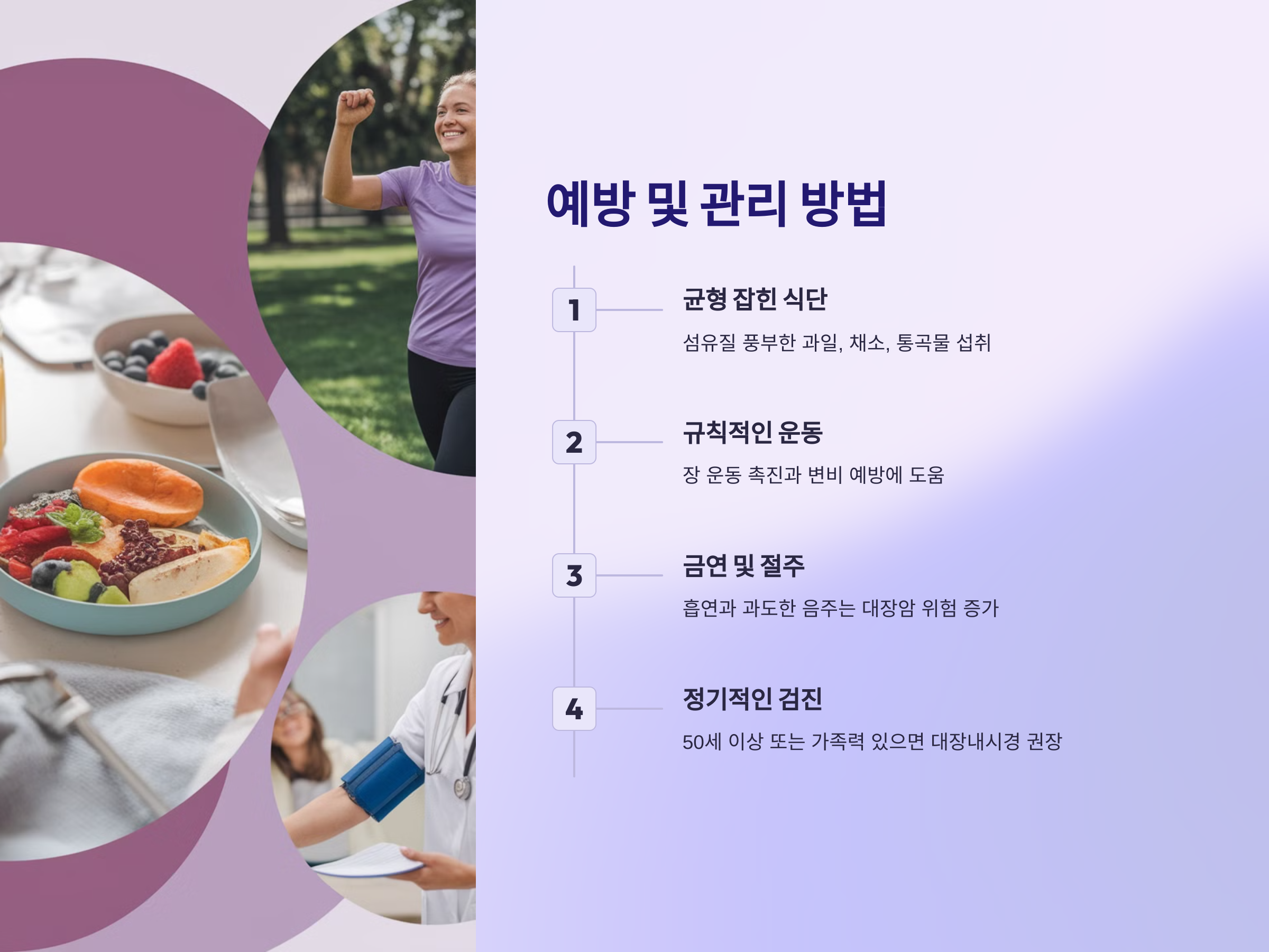 - 균형 잡힌 식단: 섬유질이 풍부한 과일, 채소, 통곡물을 충분히 섭취하고, 육류와 가공육의 섭취를 줄입니다.
