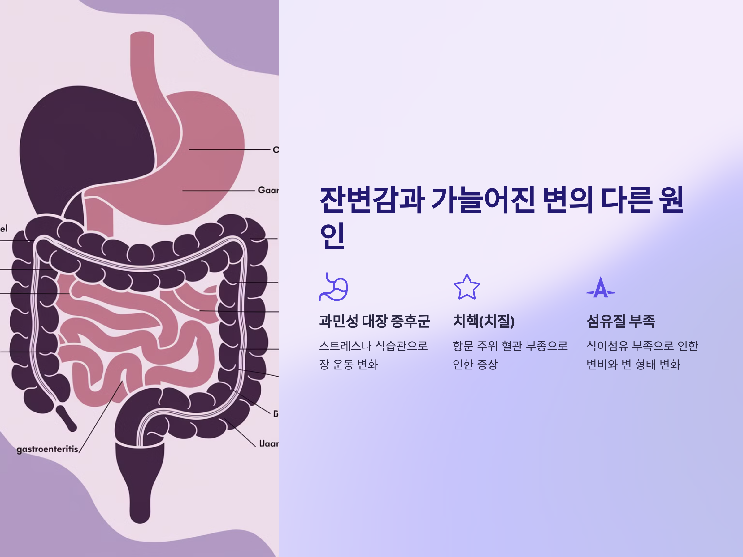 - 섬유질 부족: 식이섬유의 부족은 변비를 유발하고, 이로 인해 잔변감이나 변의 형태 변화가 나타날 수 있습니다.