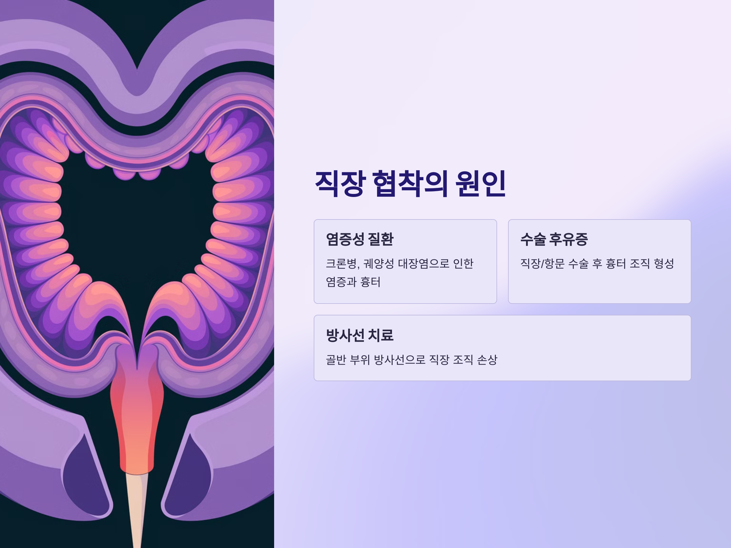 직장 협착은 직장 부위의 내강이 좁아지는 상태를 말하며, 주로 다음과 같은 원인에 의해 발생합니다.