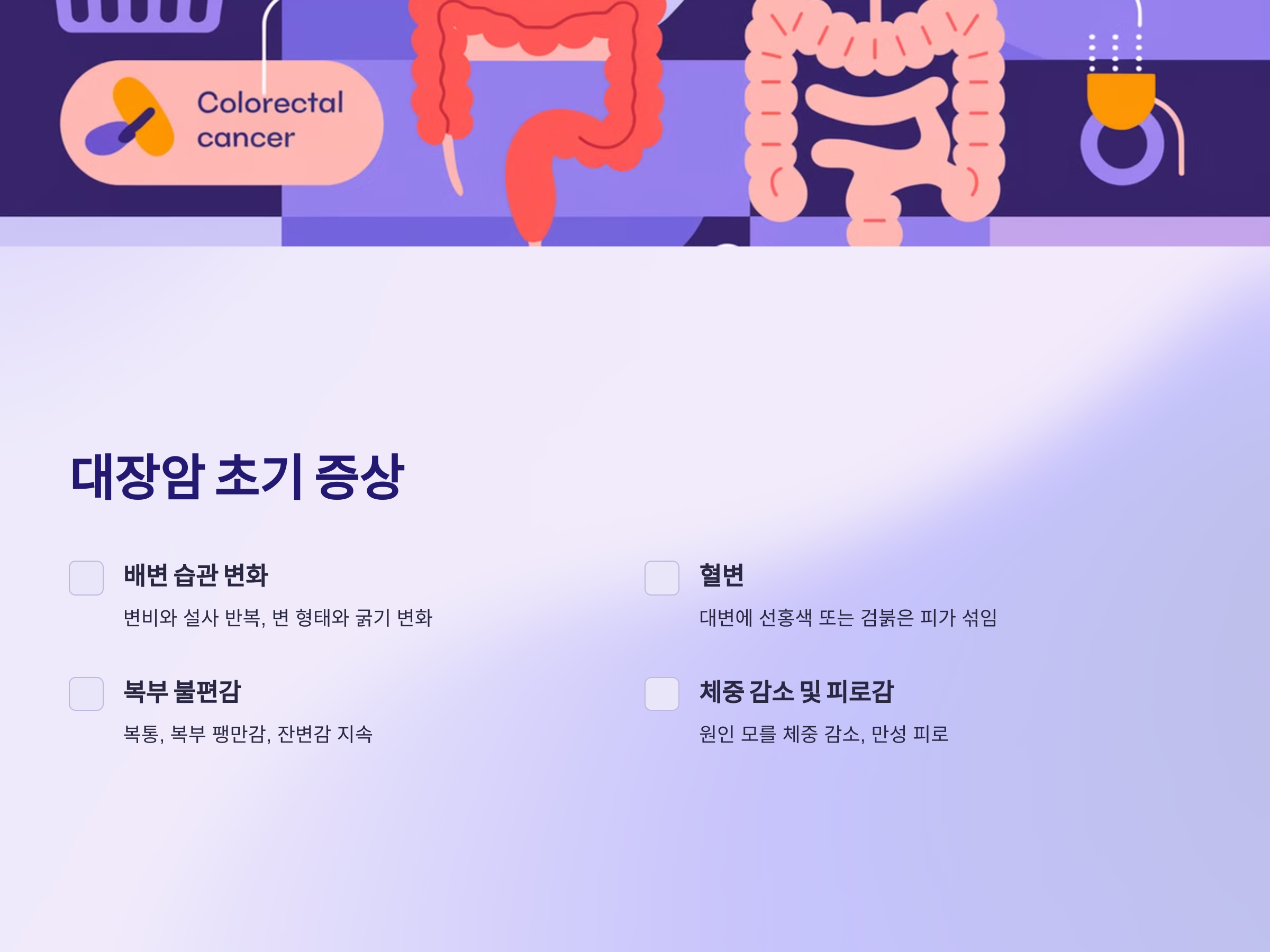 대장암은 초기에는 뚜렷한 증상이 나타나지 않을 수 있으나, 다음과 같은 신호들이 있을 수 있습니다.