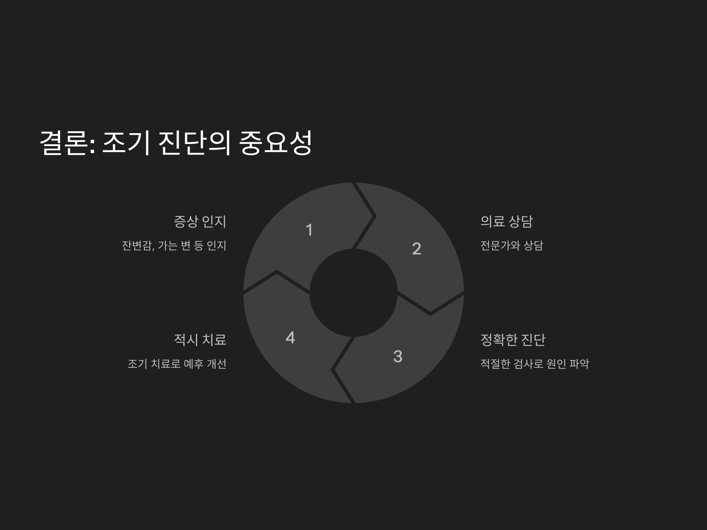 대장암은 조기에 발견되면 완치율이 높은 암입니다. 따라서 배변에 이상을 느끼거나 잔변감이 지속될 경우, 가능한 한 빨리 검사를 받는 것이 중요합니다. 대장암 초기에는 통증이나 뚜렷한 증상이 없는 경우도 많지만, 변비나 설사, 변의 형태 변화, 혈변, 체중 감소 등의 증상이 있으면 병원을 찾아 정확한 진단을 받아야 합니다.