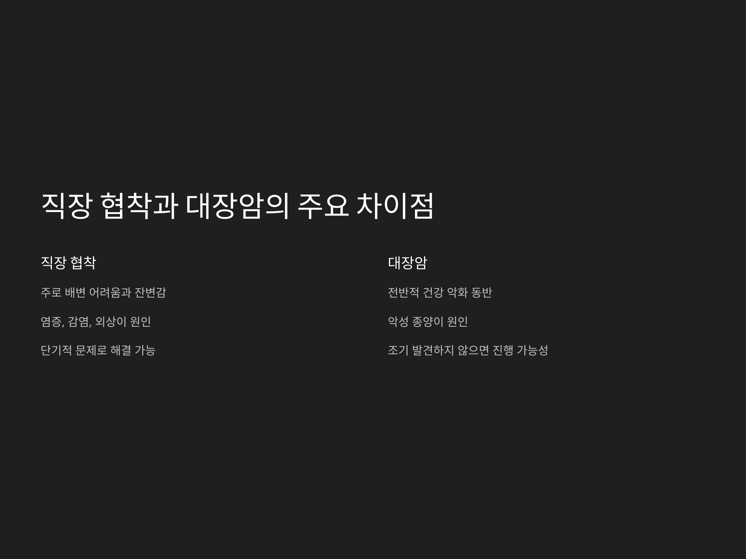 두 질환 모두 초기에는 비슷한 증상을 보일 수 있으나, 직장 협착은 대체로 단기적인 문제로 해결될 수 있는 경우가 많습니다. 반면 대장암은 조기에 발견하지 않으면 진행될 가능성이 크기 때문에, 지속적인 증상 발생 시 즉시 병원을 찾아 진단을 받는 것이 중요합니다.