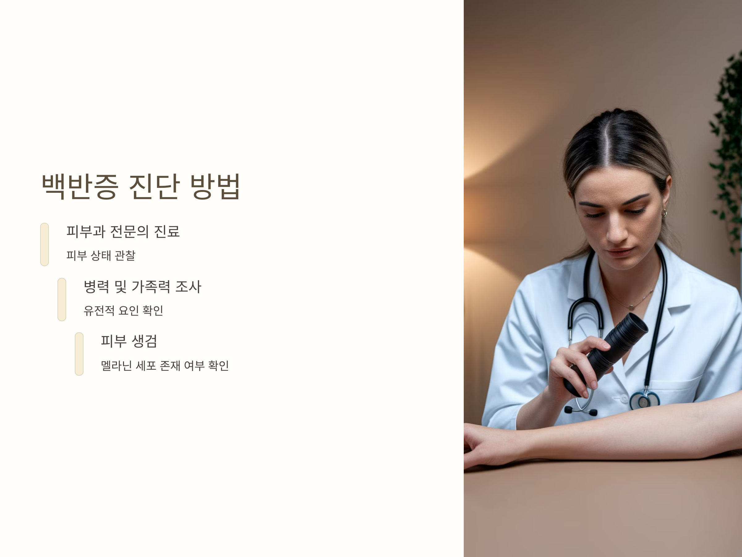 백반증을 진단하려면 전문적인 피부과 의사의 진료를 받아야 합니다. 백반증의 진단은 주로 피부의 상태를 관찰하고, 병력과 가족력을 조사하는 과정으로 이루어집니다. 때때로, 피부 생검을 통해 피부 세포에서 멜라닌 세포의 존재 여부를 확인하기도 합니다.