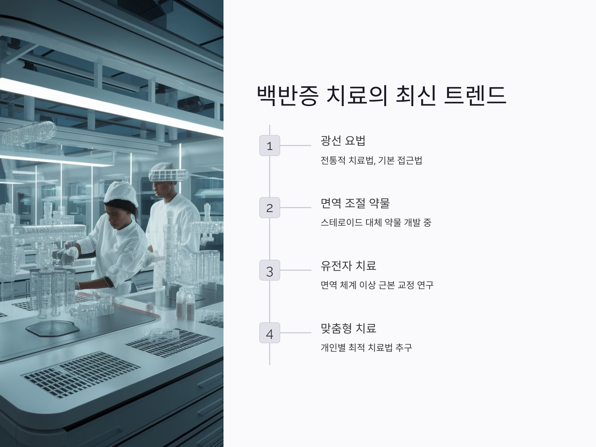 면역 체계를 조절하여 백반증을 치료하는 약물이 개발되고 있으며, 이러한 약물은 기존의 스테로이드 크림보다 더 안전하고 효과적인 대안이 될 수 있습니다.