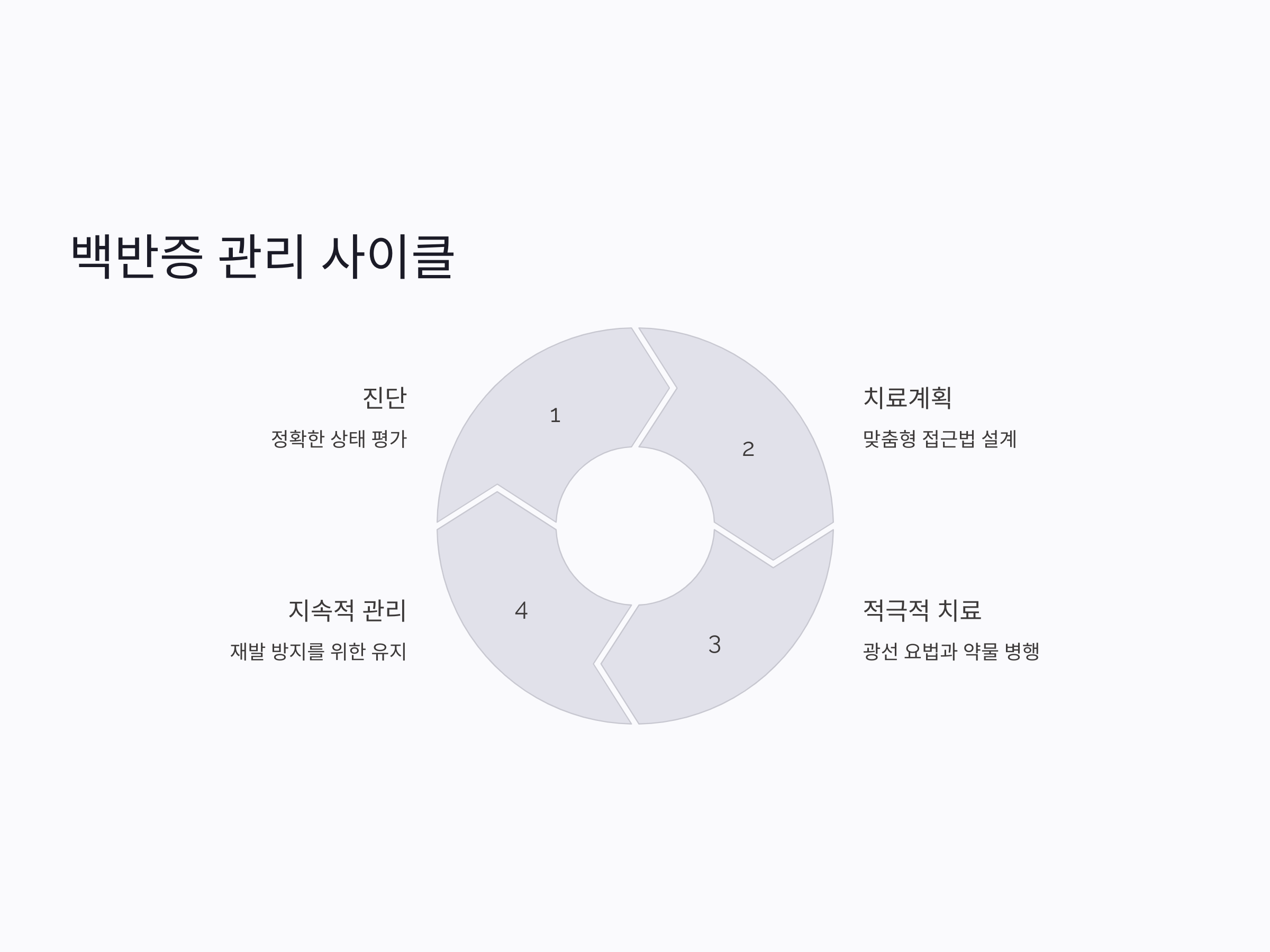 백반증은 개인마다 증상의 정도나 범위가 다르기 때문에, 치료도 개별적인 접근이 필요합니다. 전문가의 상담을 통해 자신의 상태에 맞는 치료 계획을 세우는 것이 중요합니다.