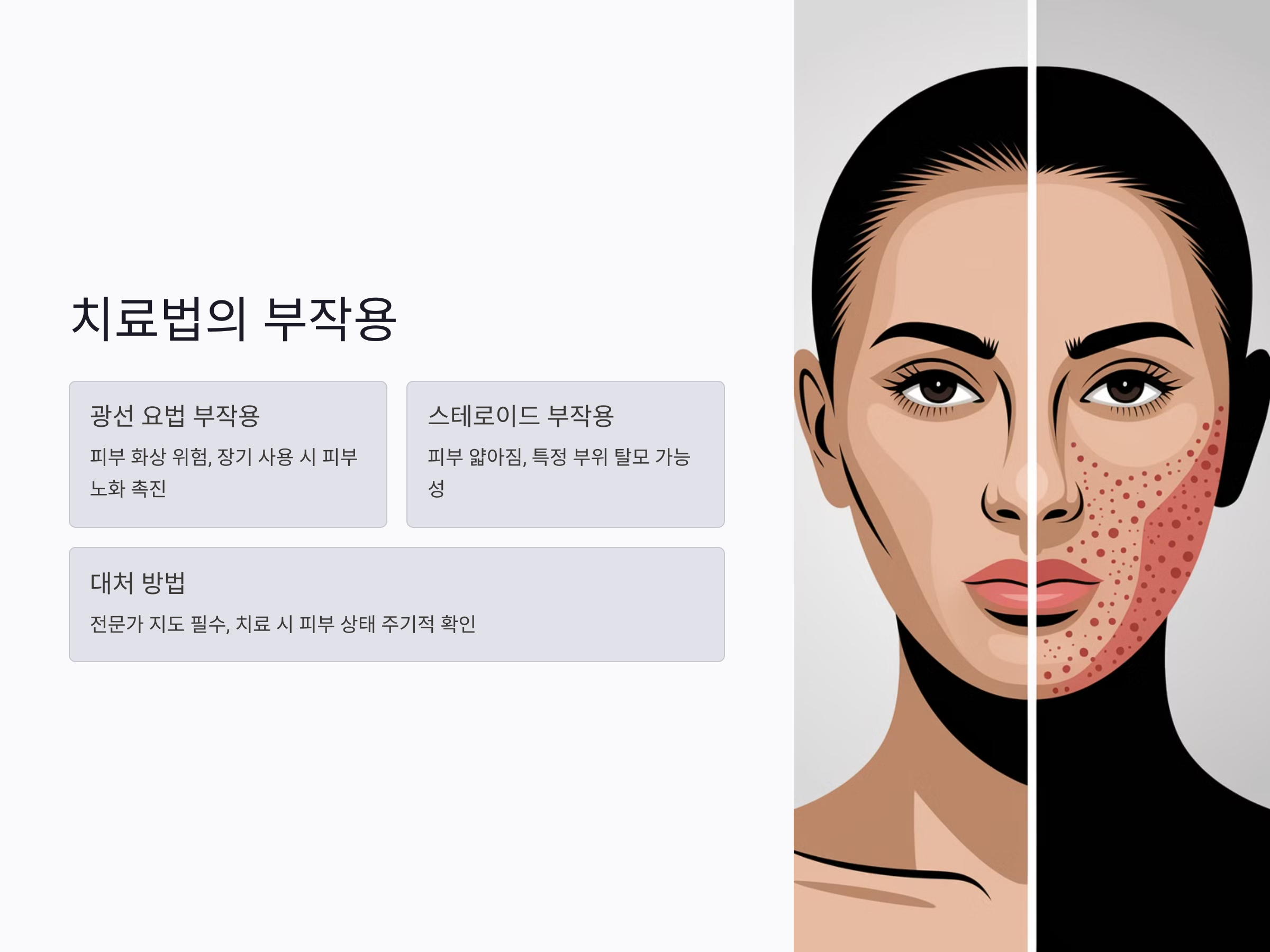 광선 요법과 스테로이드 크림은 효과적인 치료법이지만, 부작용이 있을 수 있습니다. 치료의 효과를 극대화하려면 부작용을 미리 알고 대비하는 것이 중요합니다.