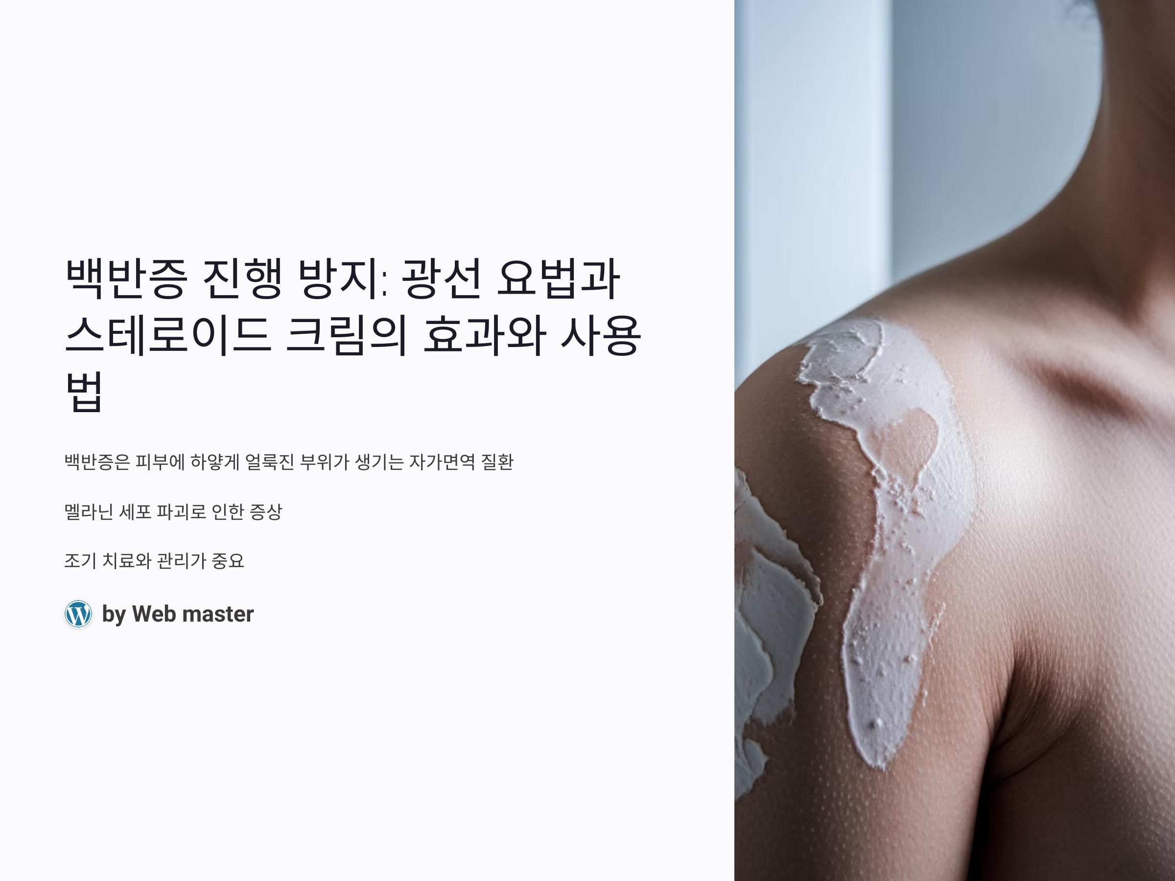 백반증의 진행을 방지하려면 광선 요법과 스테로이드 크림을 적절히 활용하는 것이 중요합니다. 이 두 가지 치료법은 백반증의 진행을 억제하고 증상을 개선하는 데 큰 도움이 됩니다. 다만, 치료는 꾸준히 지속하는 것이 중요하며, 전문가의 지시에 따라 맞춤형 치료를 받는 것이 가장 효과적입니다.