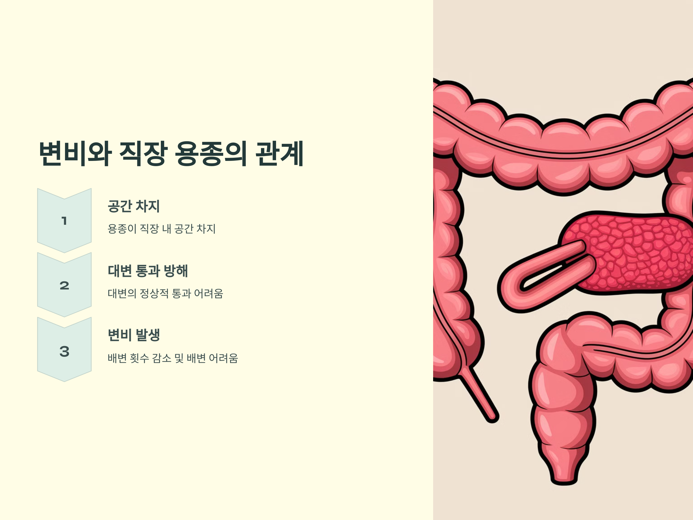 변비는 배변 횟수가 줄어들거나 배변 시 어려움을 겪는 상태를 말합니다. 직장 용종은 직장 내 공간을 차지하여 대변의 통과를 방해할 수 있습니다. 이로 인해 변비가 발생하거나 기존의 변비가 악화될 수 있습니다. 또한, 변비로 인해 배변 시 과도한 힘을 주게 되어 항문 주위의 혈관이 손상될 위험이 있습니다.