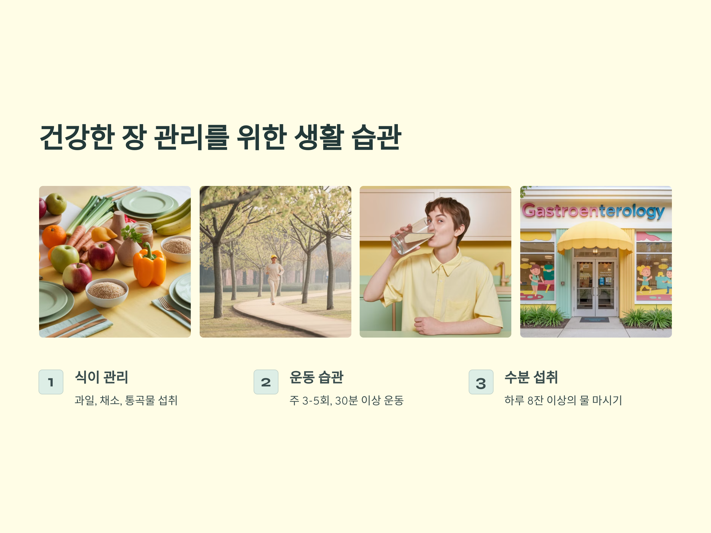 - 섬유질이 풍부한 식단: 과일, 채소, 통곡물 등을 섭취하여 장 건강을 유지합니다.