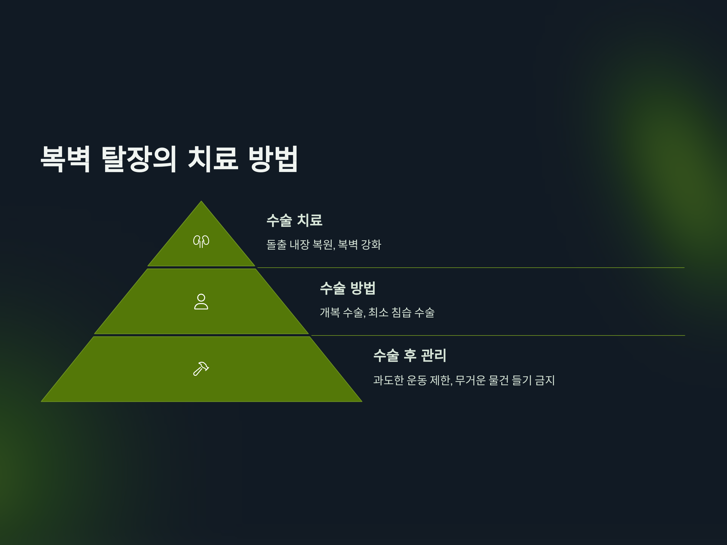 복벽 탈장의 치료는 주로 수술을 통해 이루어집니다. 수술은 돌출된 내장을 복부 내로 되돌리고, 약해진 복벽을 강화하는 방식으로 진행됩니다. 수술 후에는 복벽을 복원하여 재발을 방지하고, 탈장이 다시 발생하는 것을 예방합니다.