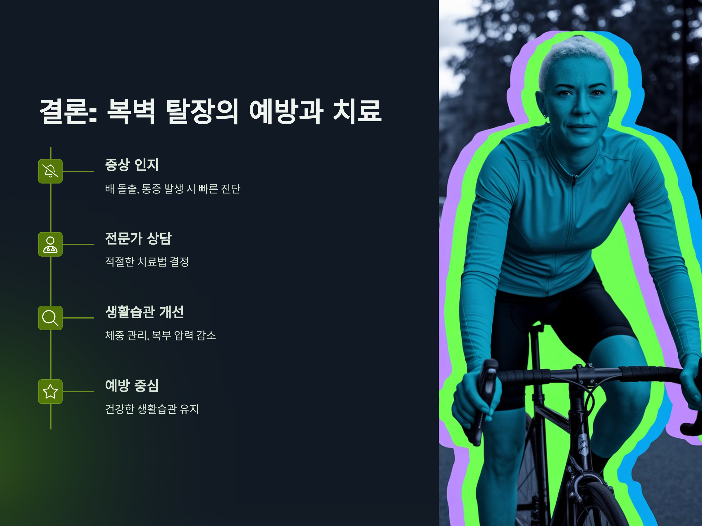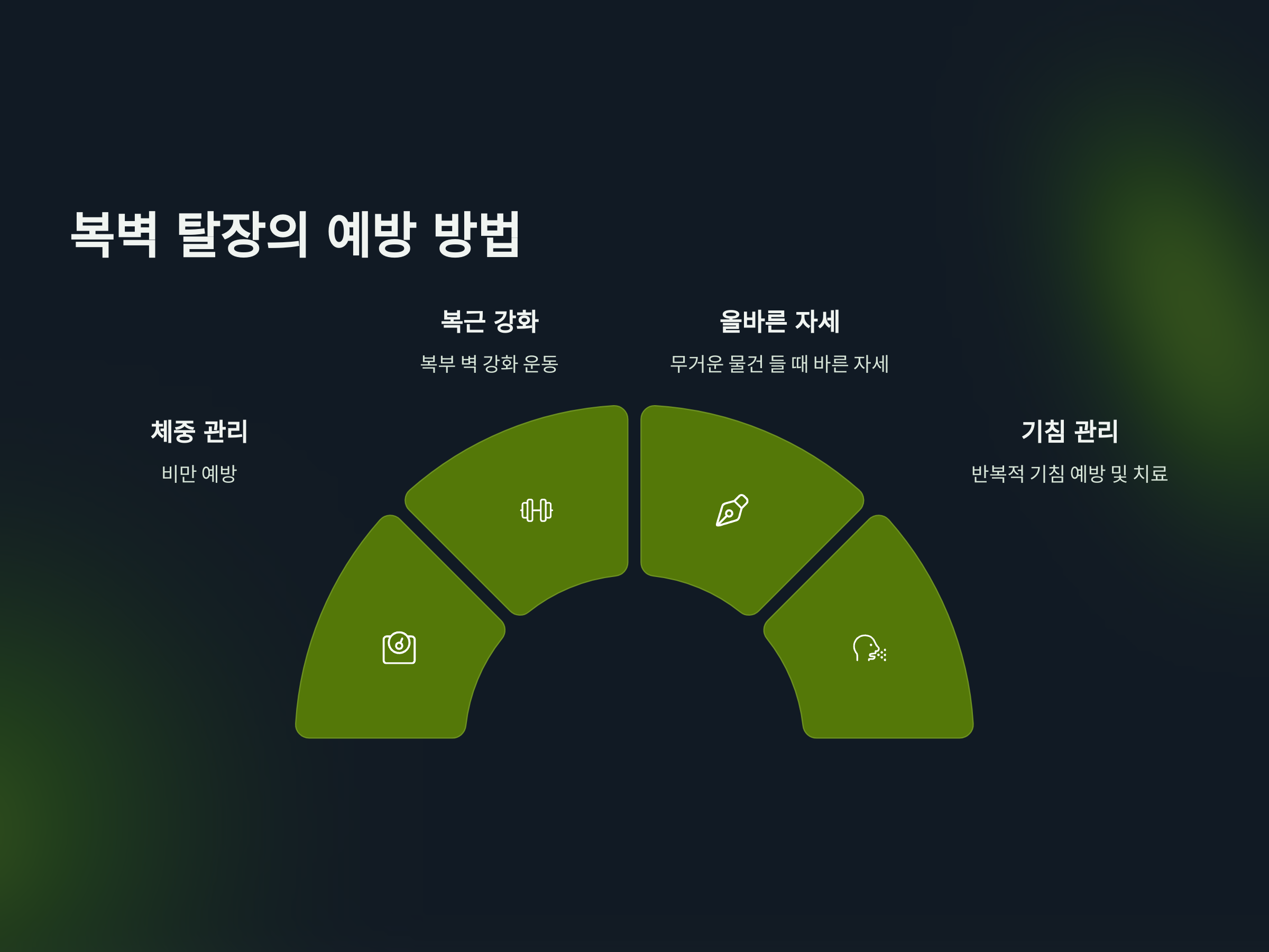 복벽 탈장은 예방이 가능한 질병이므로, 일상에서 복부에 무리가 가지 않도록 주의하고, 건강한 생활습관을 유지하는 것이 가장 효과적인 예방책입니다. 특히 비만과 과도한 복부 압력을 피하는 것이 핵심입니다.