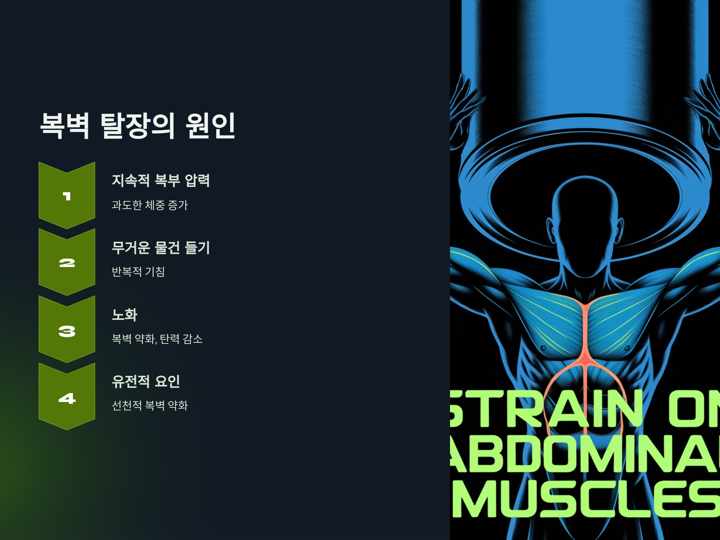 복벽 탈장은 주로 복부에 지속적인 압력이 가해질 때 발생합니다. 가장 흔한 원인은 과도한 체중 증가, 무거운 물건을 자주 들어올리는 습관, 또는 반복적인 기침과 같은 활동으로 복부에 압력이 가해지는 것입니다. 또한, 나이가 들면서 복벽이 약해지고 탄력을 잃어 탈장이 발생할 위험이 커집니다.