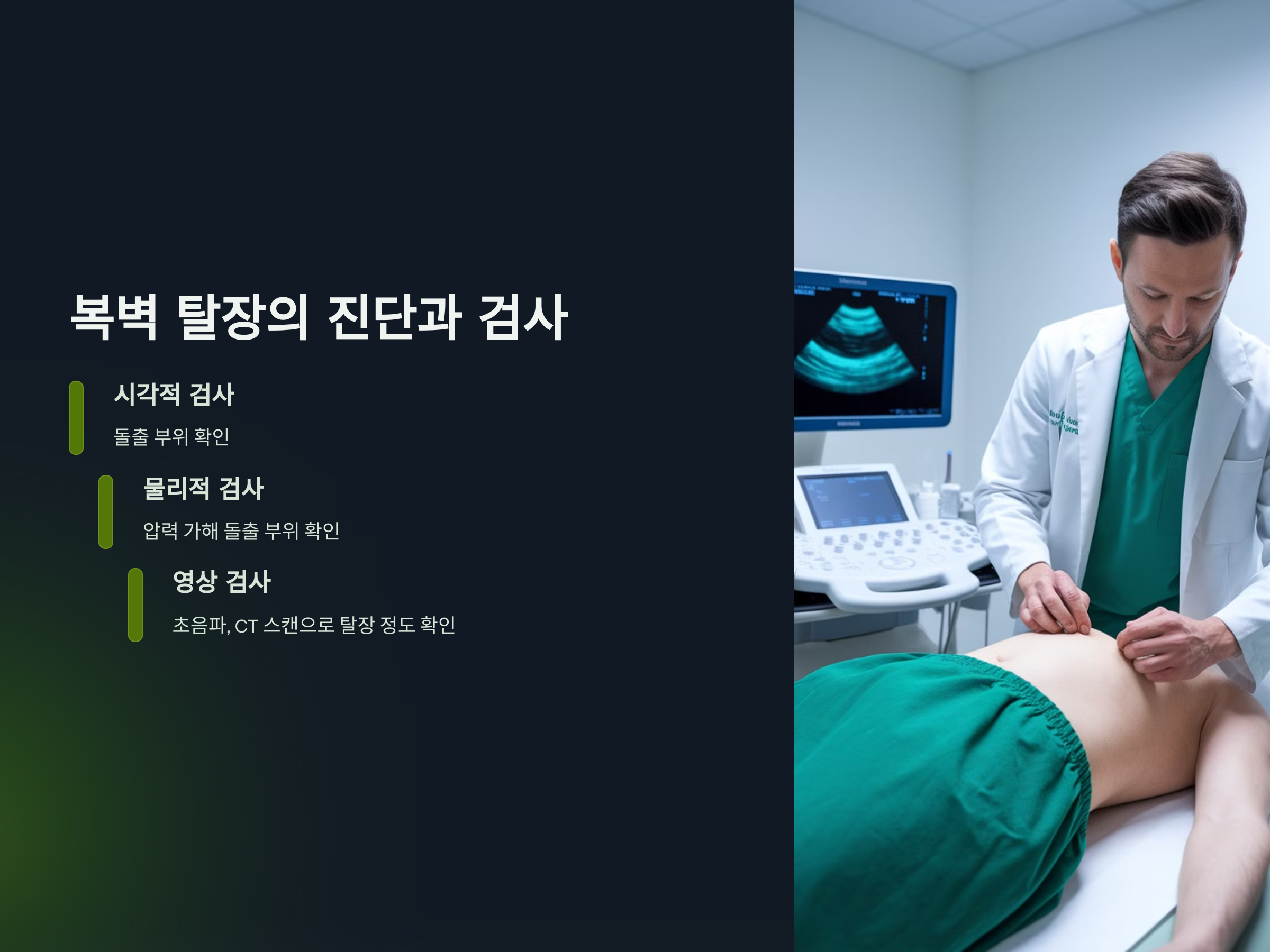 복벽 탈장은 시각적인 검사와 물리적 검사를 통해 진단할 수 있습니다. 의사는 환자가 탈장의 증상을 호소하는 부위를 확인하고, 해당 부위에 압력을 가해보며 돌출 부위가 정상적인지 확인합니다. 이 과정을 통해 대부분의 탈장은 진단됩니다.