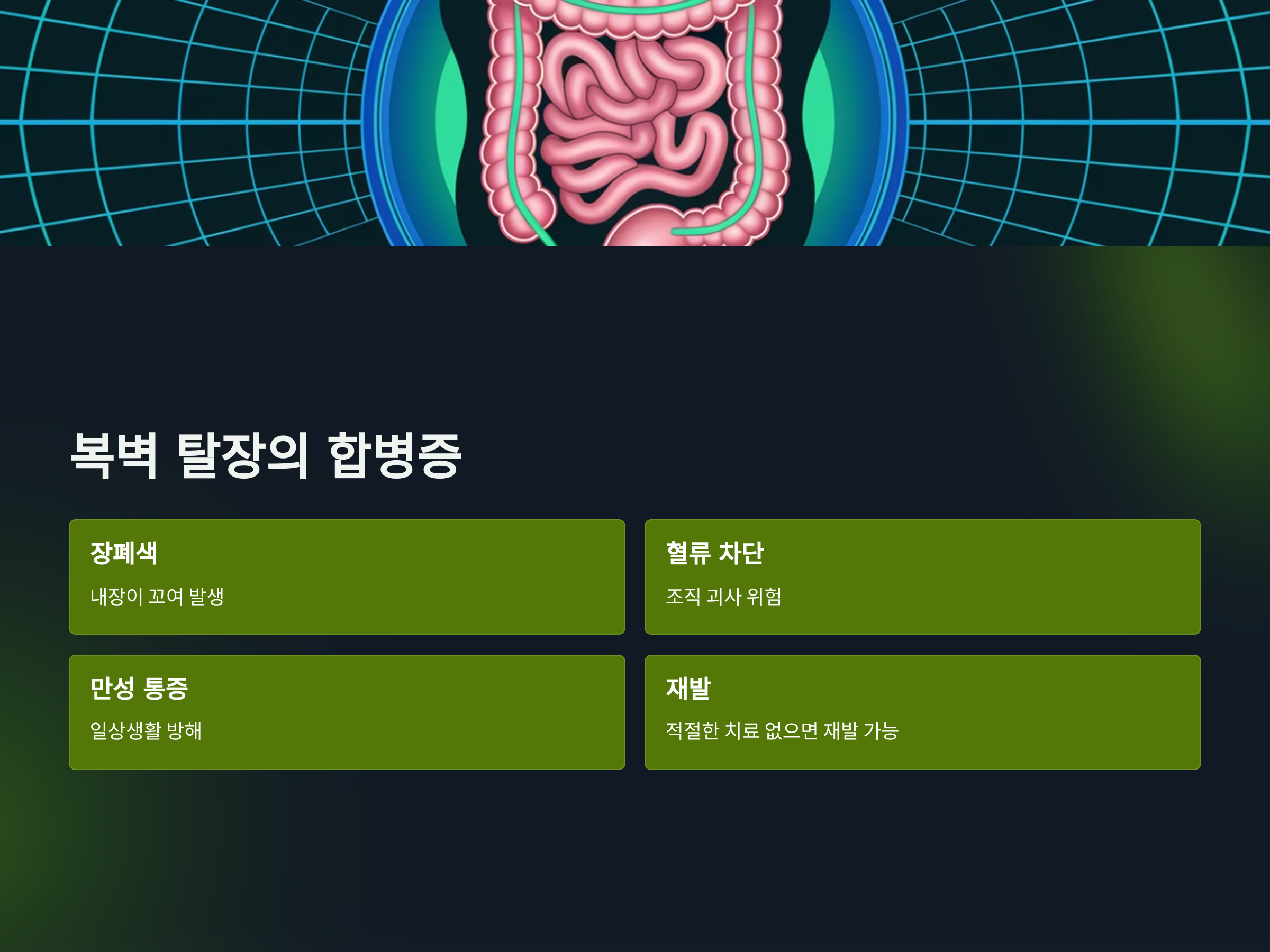 복벽 탈장은 적절한 치료를 받지 않으면 심각한 합병증을 일으킬 수 있는 상태입니다. 따라서 증상이 나타나면 가능한 한 빨리 전문가에게 진단을 받고, 적절한 치료를 받는 것이 중요합니다. 치료 방법은 대부분 수술로 이루어지며, 수술 후 관리와 생활습관 개선이 필요합니다.