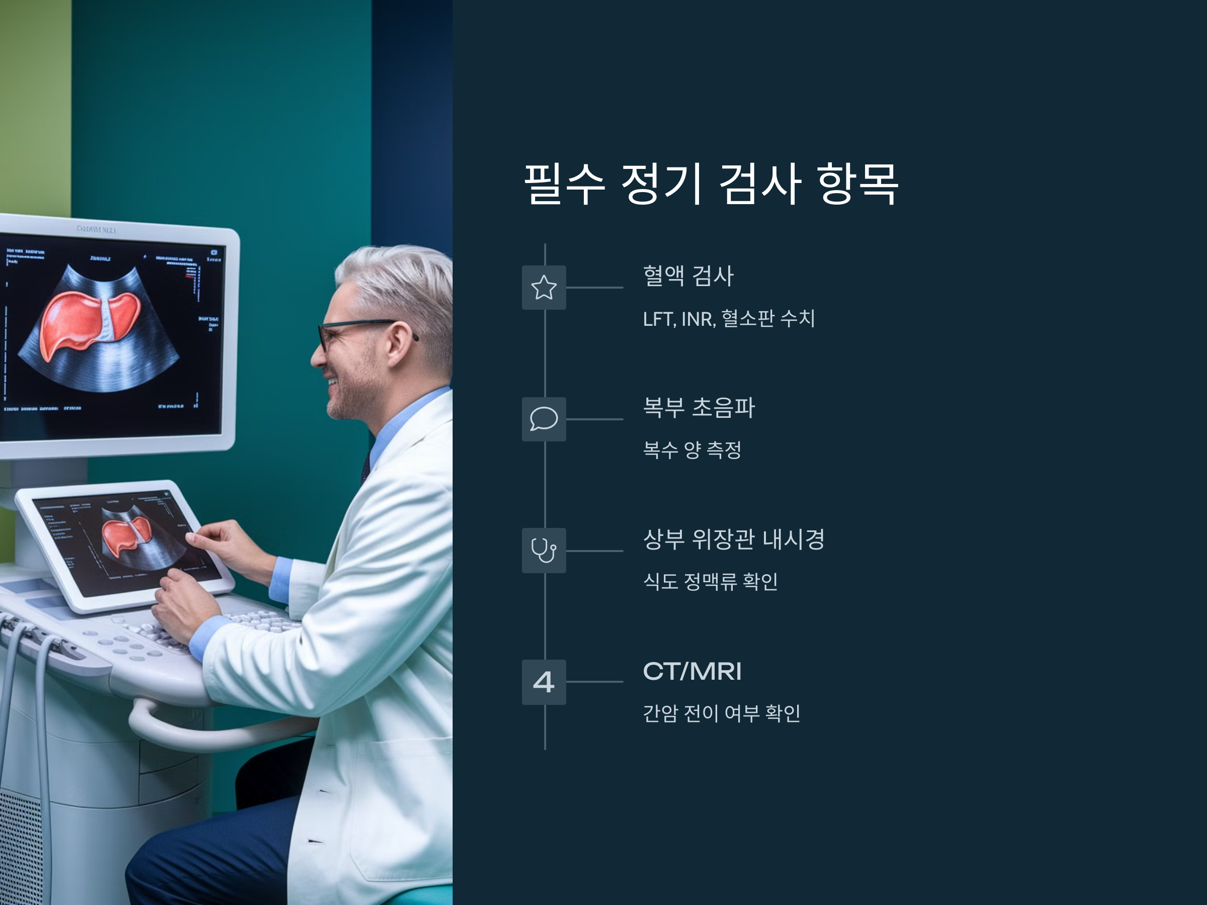 간경화 진행 시 다음과 같은 검사를 정기적으로 시행해야 합니다: 혈액검사(LFT, INR, 혈소판 수치), 복부 초음파, 상부 위장관 내시경, CT 또는 MRI 등입니다. 복수의 양을 측정하거나 감염 여부를 진단하기 위한 복수 천자 역시 필수적입니다. 정기 검진을 통해 간암으로의 전이 여부를 조기에 발견할 수 있으며, 출혈 가능성을 사전에 예측하고 적절한 약물 치료를 받을 수 있습니다. 복부가 불룩해지고, 피부에 멍이 자주 생긴다면 이것은 단순한 노화가 아니라 간경화의 강력한 신호일 수 있습니다. 정확한 진단이 건강을 지키는 첫걸음입니다.