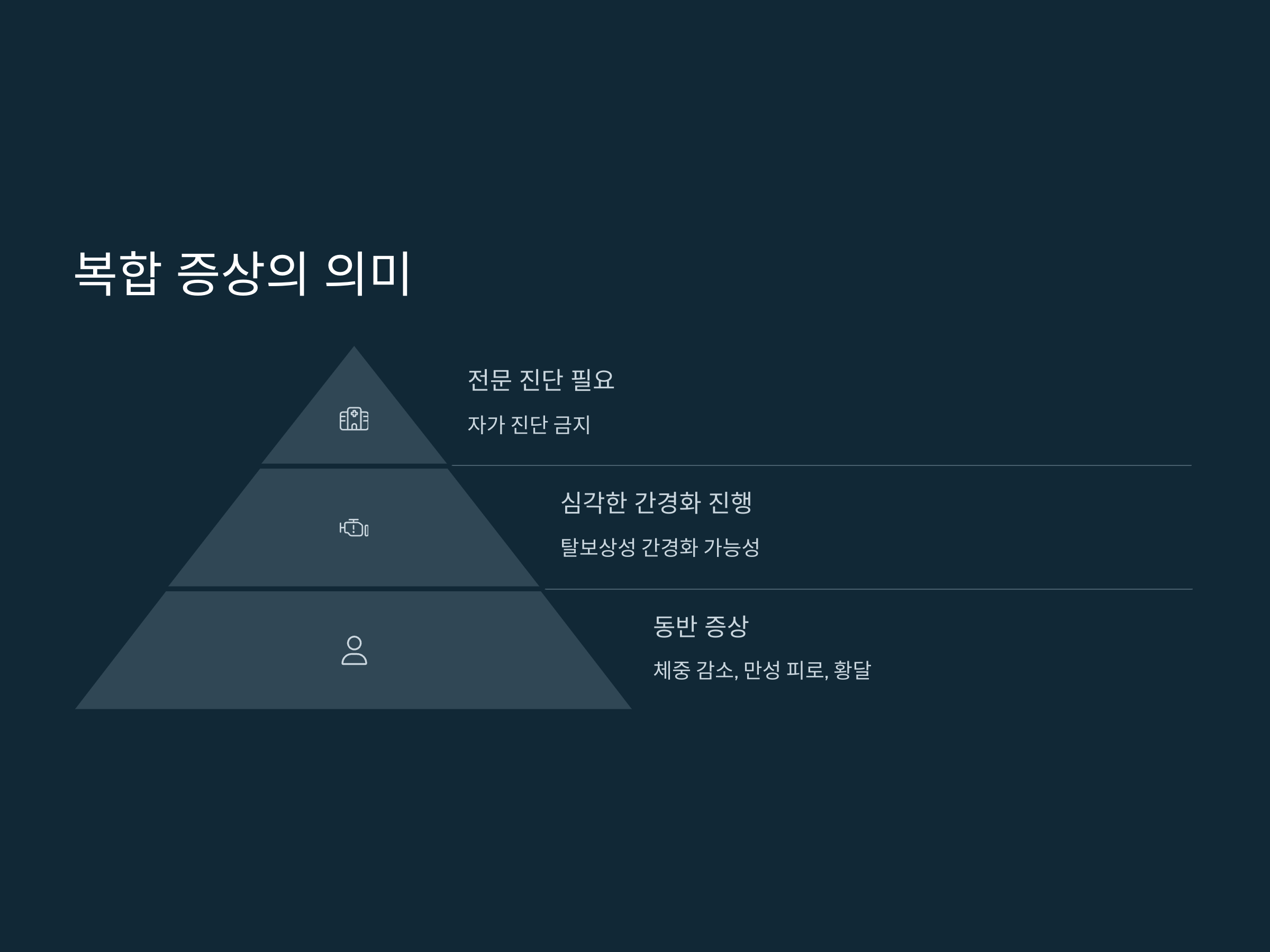 복부 팽만과 출혈 증상이 동시에 나타난다는 것은 단순한 간기능 저하를 넘어선 심각한 간경화의 진행을 의미합니다. 특히 체중 감소, 만성 피로, 황달과 함께 복수가 동반되고 쉽게 멍이 든다면, 이는 탈보상성 간경화 혹은 간암의 가능성도 배제할 수 없습니다. 따라서 이러한 복합 증상이 나타날 경우 스스로 진단하거나 민간요법에 의존하기보다는 빠른 시간 내에 병원에서 간기능 검사, 초음파, 복수 천자 등 정밀 진단을 받아야 합니다. 전문의의 진단을 바탕으로 정맥 내 이뇨제 투여나, 경우에 따라 간이식 여부까지 고려하는 것이 안전합니다.