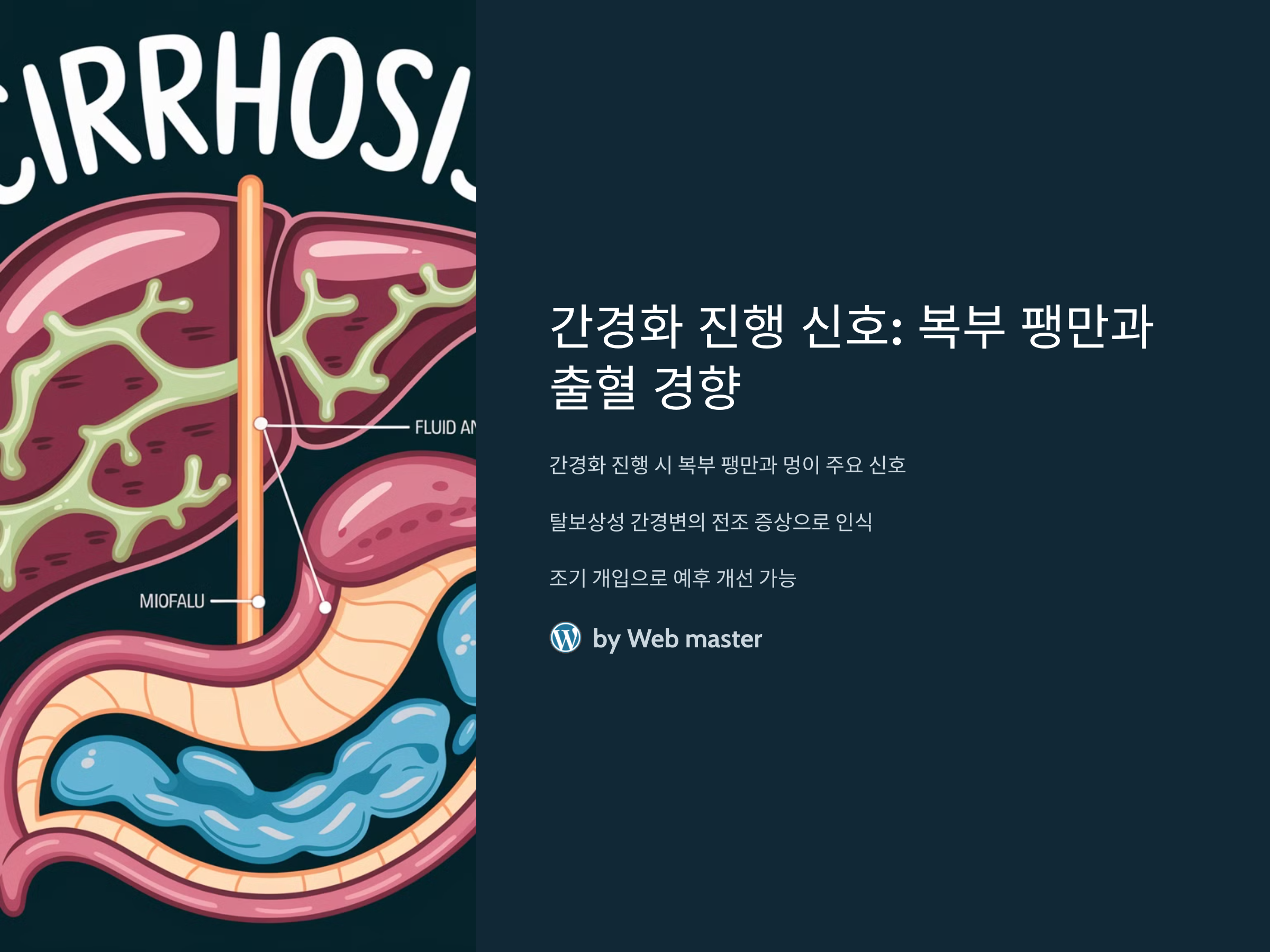 간경화가 진행되면 체내 여러 장기와 혈액 순환에 영향을 미치게 됩니다. 특히 눈에 띄는 변화 중 하나는 바로 복부 팽만과 멍 또는 잦은 출혈입니다. 최근 간질환 환자들 사이에서 복수(복강 내 체액 축적)와 출혈성 소견이 빈번히 보고되며, 이는 간 기능 저하의 명확한 지표로 인식되고 있습니다. 특히 단백질 합성 저하로 인한 혈장 알부민 감소와 응고 인자 부족이 이러한 증상을 촉진합니다. 의료계에서는 이를 '탈보상성 간경변'의 전조로 간주하고 조기 개입을 권고하고 있습니다. 조기 치료를 통해 복수 형성을 억제하고, 출혈 위험을 낮추는 것이 예후 개선에 결정적입니다. 이번 포스팅에서는 간경화로 인한 복부 팽만과 출혈 경향의 원인, 증상, 대응 방법, 그리고 무엇보다 놓치지 말아야 할 조기 신호에 대해 깊이 있게 다뤄보겠습니다.