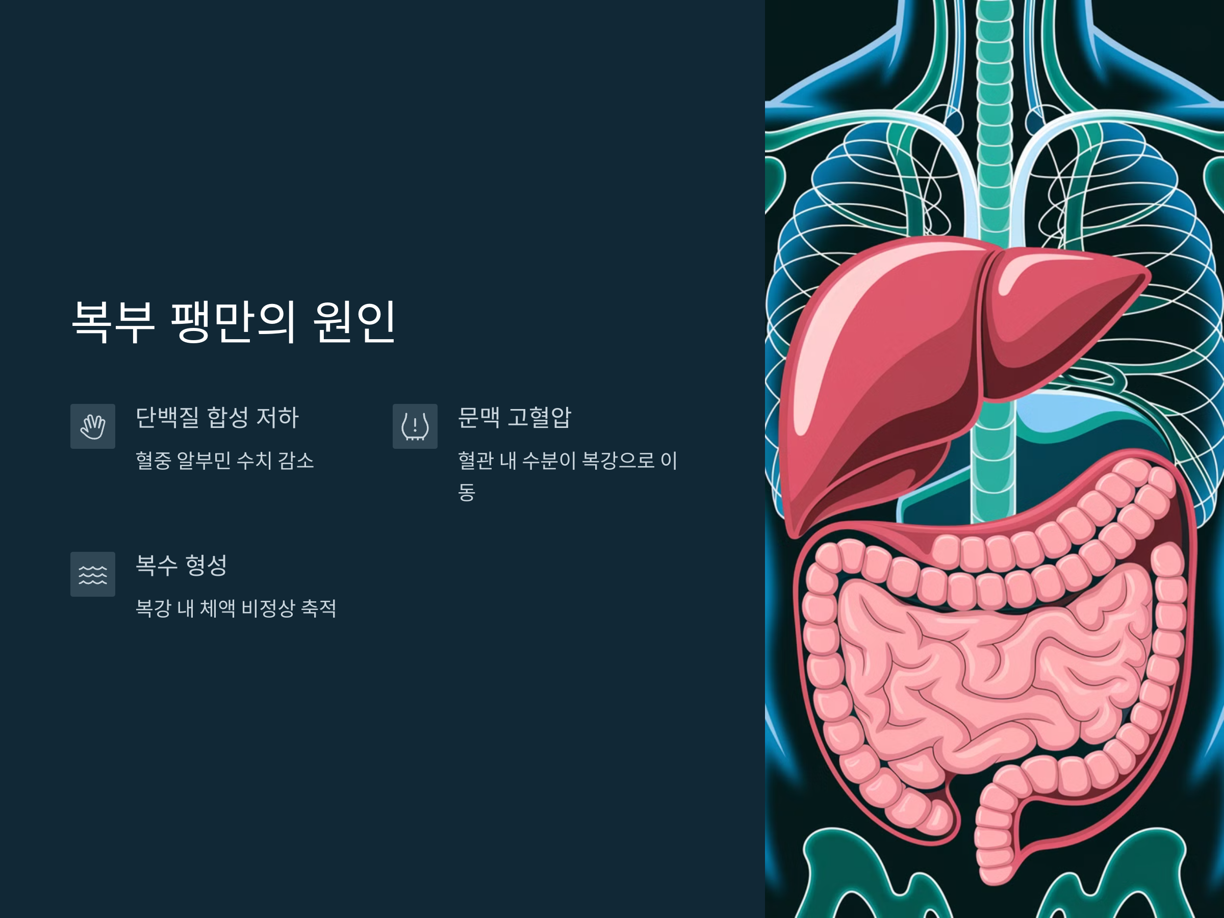 간경화가 일정 단계에 이르면 복강 내 체액이 비정상적으로 축적되며 복수가 생깁니다. 이 복수는 간의 단백질 합성 능력 저하와 문맥 고혈압으로 인해 발생합니다. 간이 손상되면 혈중 알부민 수치가 떨어지고, 혈관 내 수분이 조직으로 빠져나가면서 복강에 고이게 됩니다. 복수가 차게 되면 외관상 배가 부풀어 오르고, 눕거나 움직일 때 통증을 동반할 수 있으며, 식사량 감소 및 호흡 곤란까지 유발합니다. 특히 짧은 기간 내 복부 팽만이 심해졌다면 반드시 간기능 검사를 포함한 전문 진단이 필요합니다.