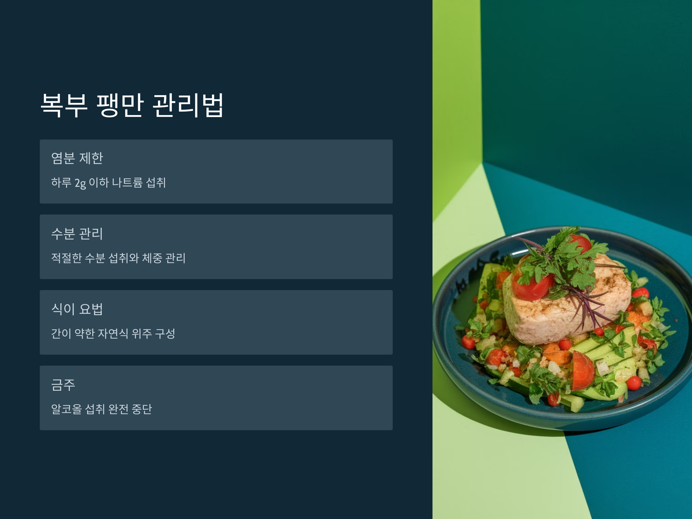 간경화로 인해 발생한 복부 팽만은 치료만큼이나 꾸준한 생활 관리가 중요합니다. 첫째, 염분 섭취를 제한해야 합니다. 염분은 체내 수분을 유지시키기 때문에 복수 형성을 가속화합니다. 하루 2g 이하의 나트륨 섭취가 권장되며, 음식은 간이 약한 자연식 위주로 구성하는 것이 좋습니다. 둘째, 적절한 수분 섭취와 체중 관리가 필요합니다. 급격한 체중 증가는 복수 재발의 신호일 수 있습니다. 마지막으로 금주와 간 건강 보조제에 대한 상담을 병행하는 것이 좋습니다. 영양사는 개인 맞춤 식단을 설계해줄 수 있으므로 적극적인 상담이 도움이 됩니다.