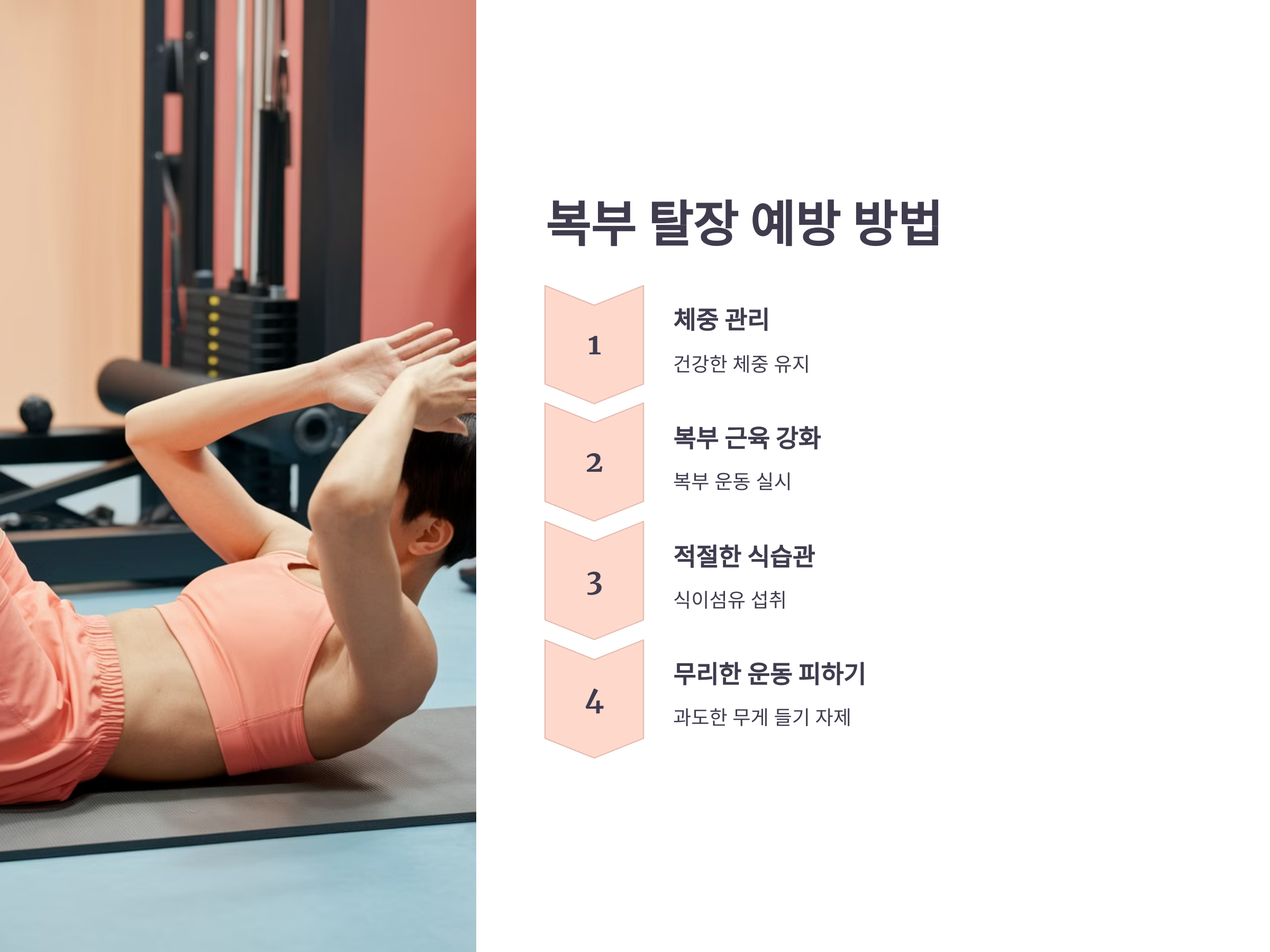 - 복부 근육 강화 운동: 복부 근육을 강화하는 운동을 통해 복부 벽을 튼튼하게 만들 수 있습니다.