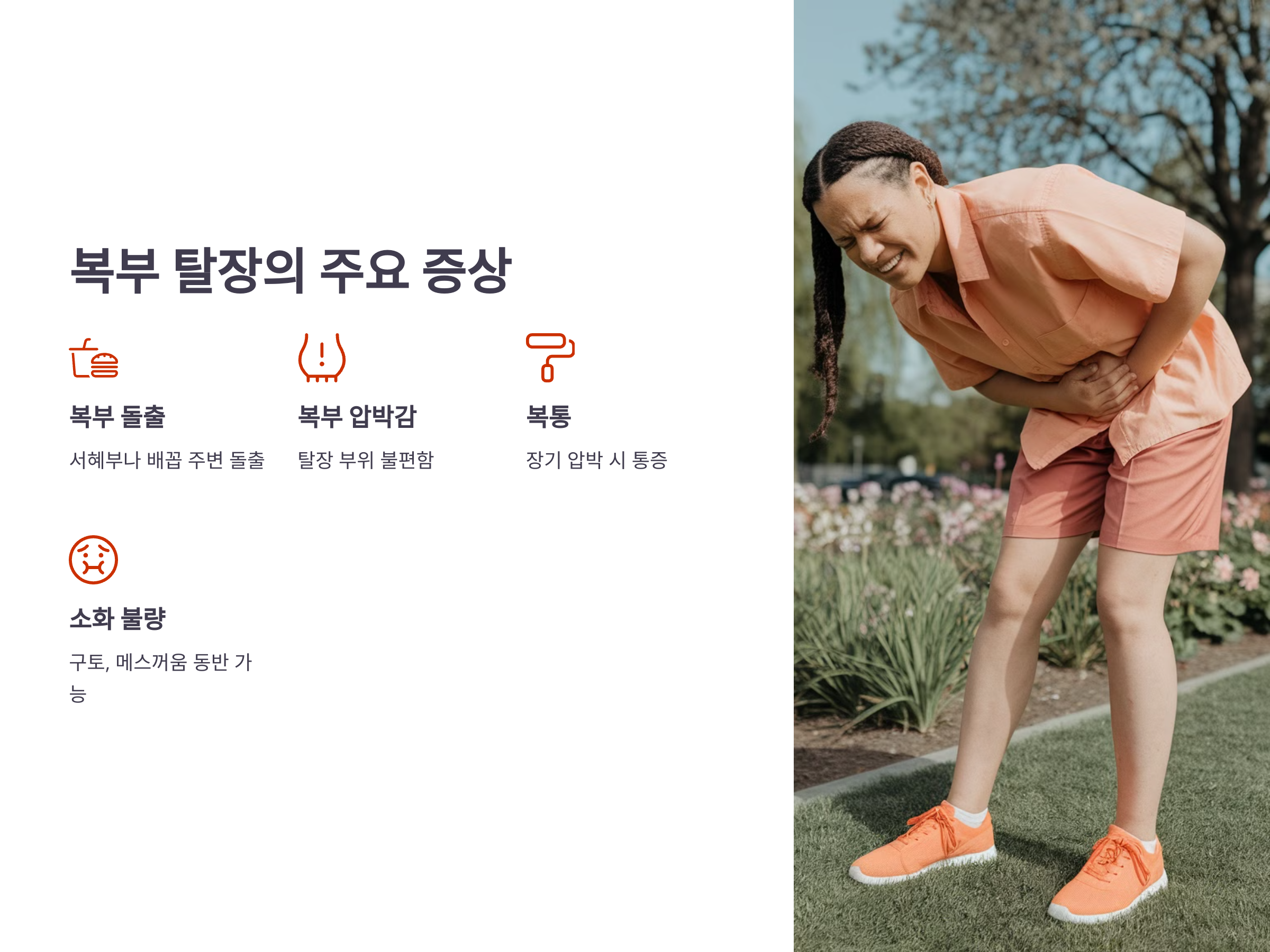 - 복부 돌출: 가장 뚜렷한 증상은 복부가 돌출되는 것입니다. 돌출된 부위는 보통 서혜부(사타구니)나 배꼽 주변에서 볼 수 있습니다.