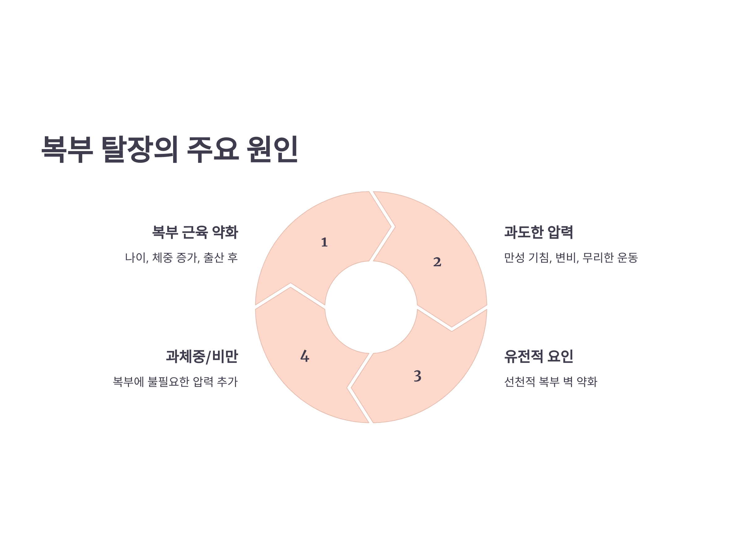 - 복부 근육의 약화: 나이가 들거나 과도한 체중 증가, 출산 후 등으로 복부 근육이 약해질 수 있습니다.