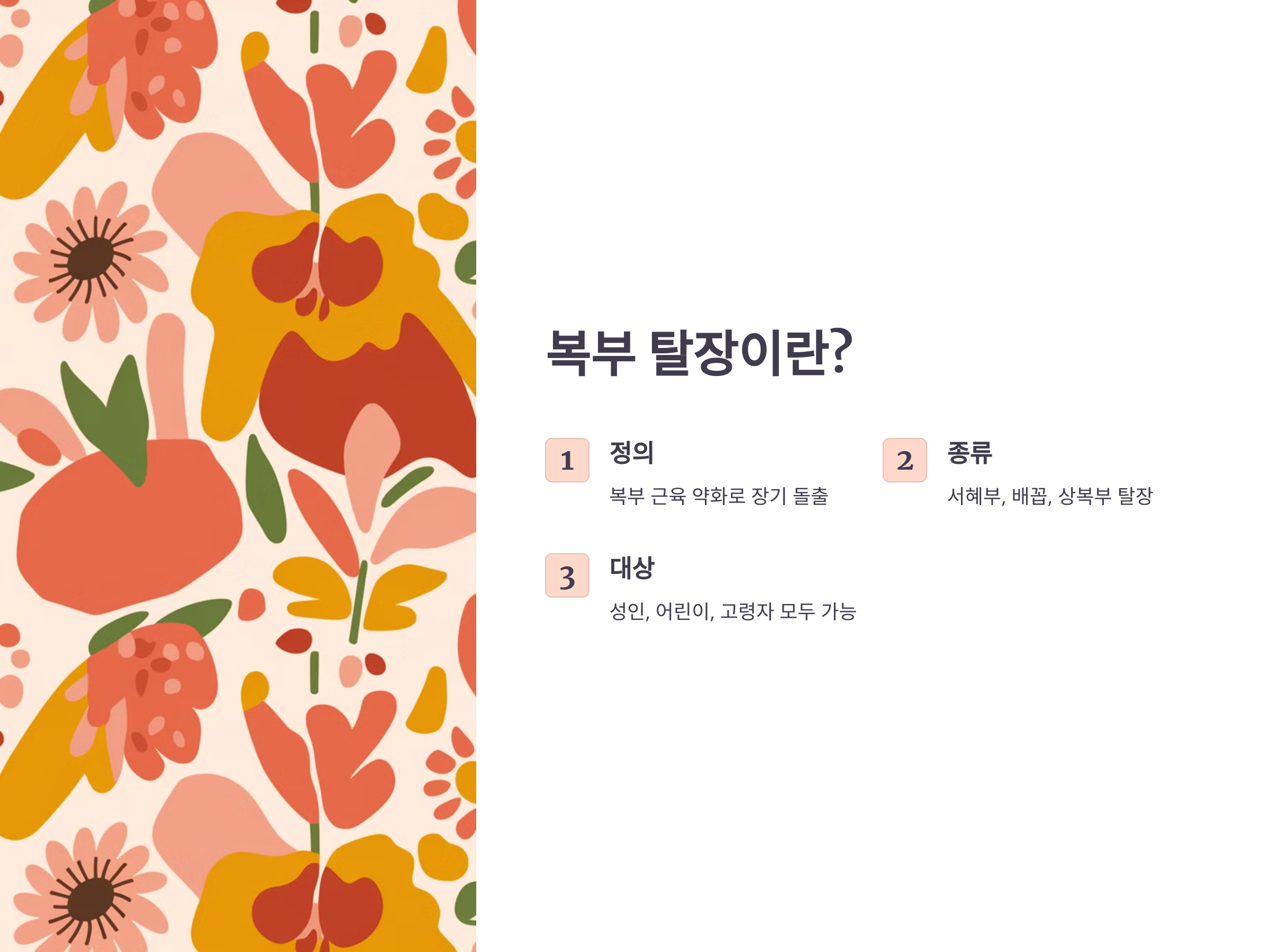 복부 탈장은 복부 내부 장기가 복벽을 통해 돌출되는 상태로, 배에 통증과 압박감을 유발할 수 있는 질환입니다. 이 글에서는 복부 탈장의 주요 증상, 원인, 치료 방법 및 예방책에 대해 자세히 설명합니다. 특히 복부 돌출과 압박감을 겪고 있는 분들에게 도움이 될 수 있는 정보들을 정리했습니다.