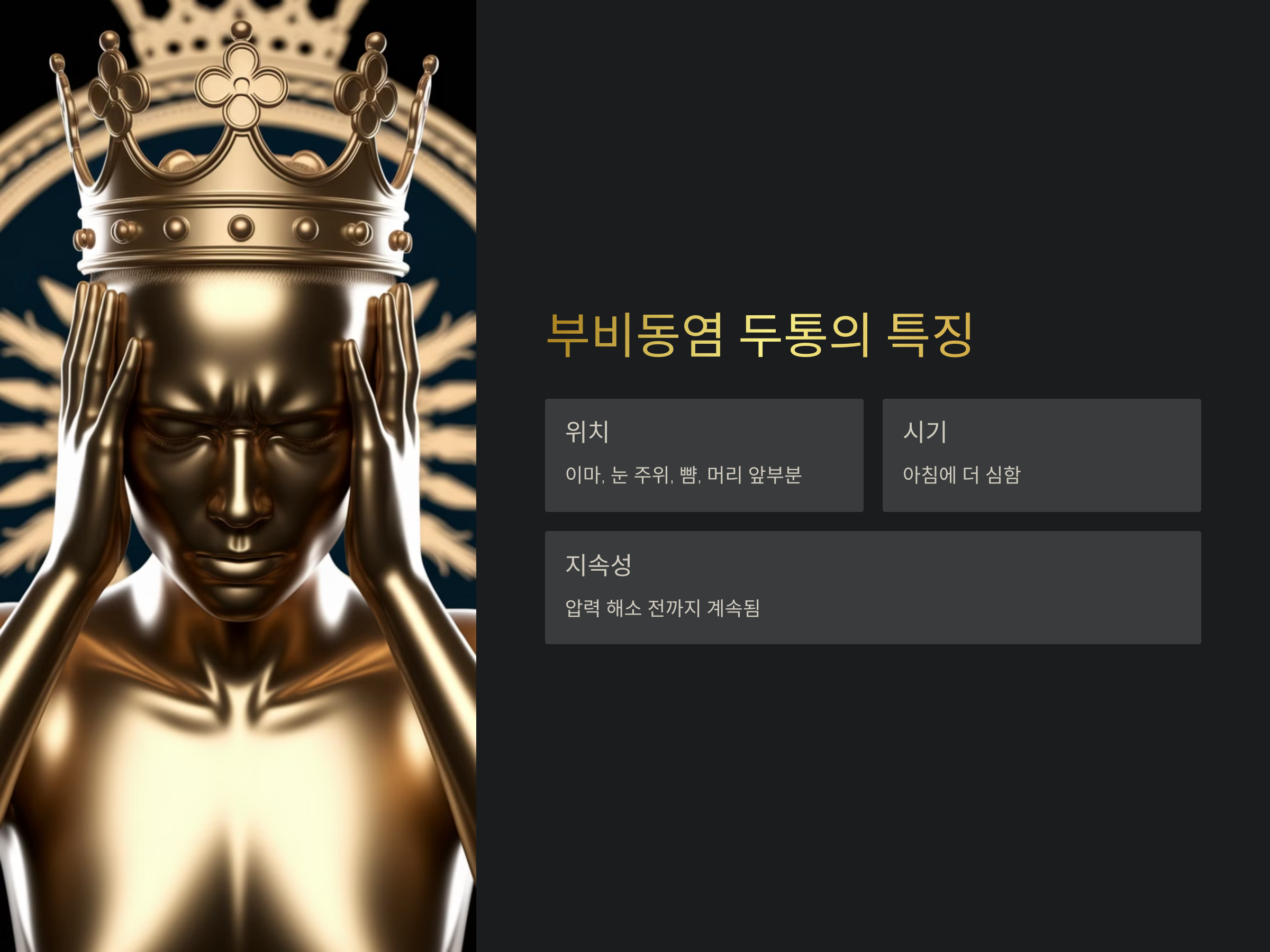 부비동염으로 인한 두통은 일반적인 두통과는 다른 양상을 보입니다. 부비동염에 의한 두통은 주로 이마, 눈 주위, 뺨, 또는 머리의 앞부분에서 발생합니다. 이는 부비동의 압력이 뇌로 전달되면서 발생하는 통증으로, 보통 아침에 일어났을 때 더 심하게 느껴집니다. 이 두통은 일반적인 두통과는 달리, 부비동 압력이 풀리지 않으면 계속해서 이어질 수 있습니다.