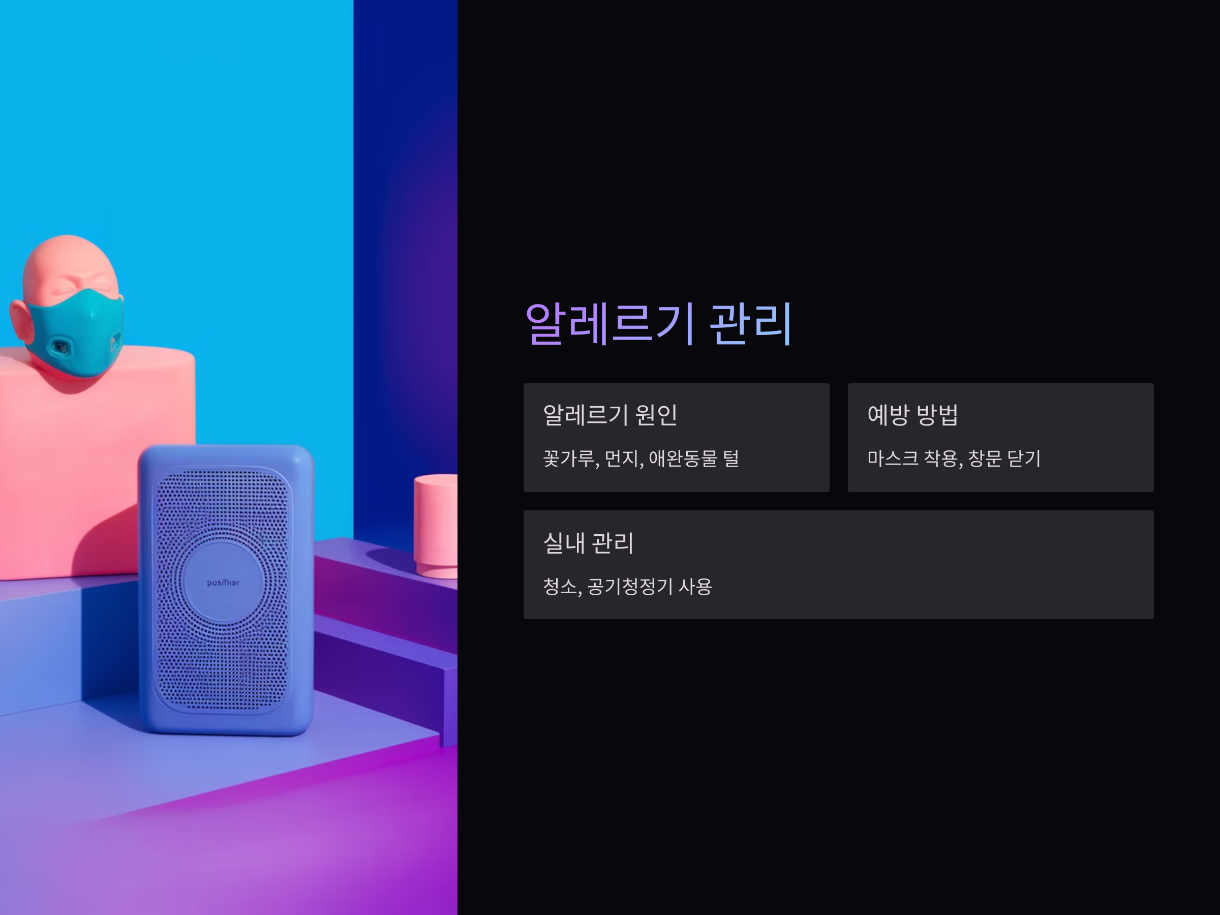 먼저, 알레르기 유발 물질인 꽃가루나 먼지, 애완동물의 털 등을 피하는 것이 중요합니다. 특히 봄철이나 가을철에는 꽃가루가 많이 날리므로 외출 시 마스크를 착용하거나 실내에 있을 때 창문을 닫아 두는 것이 좋습니다.