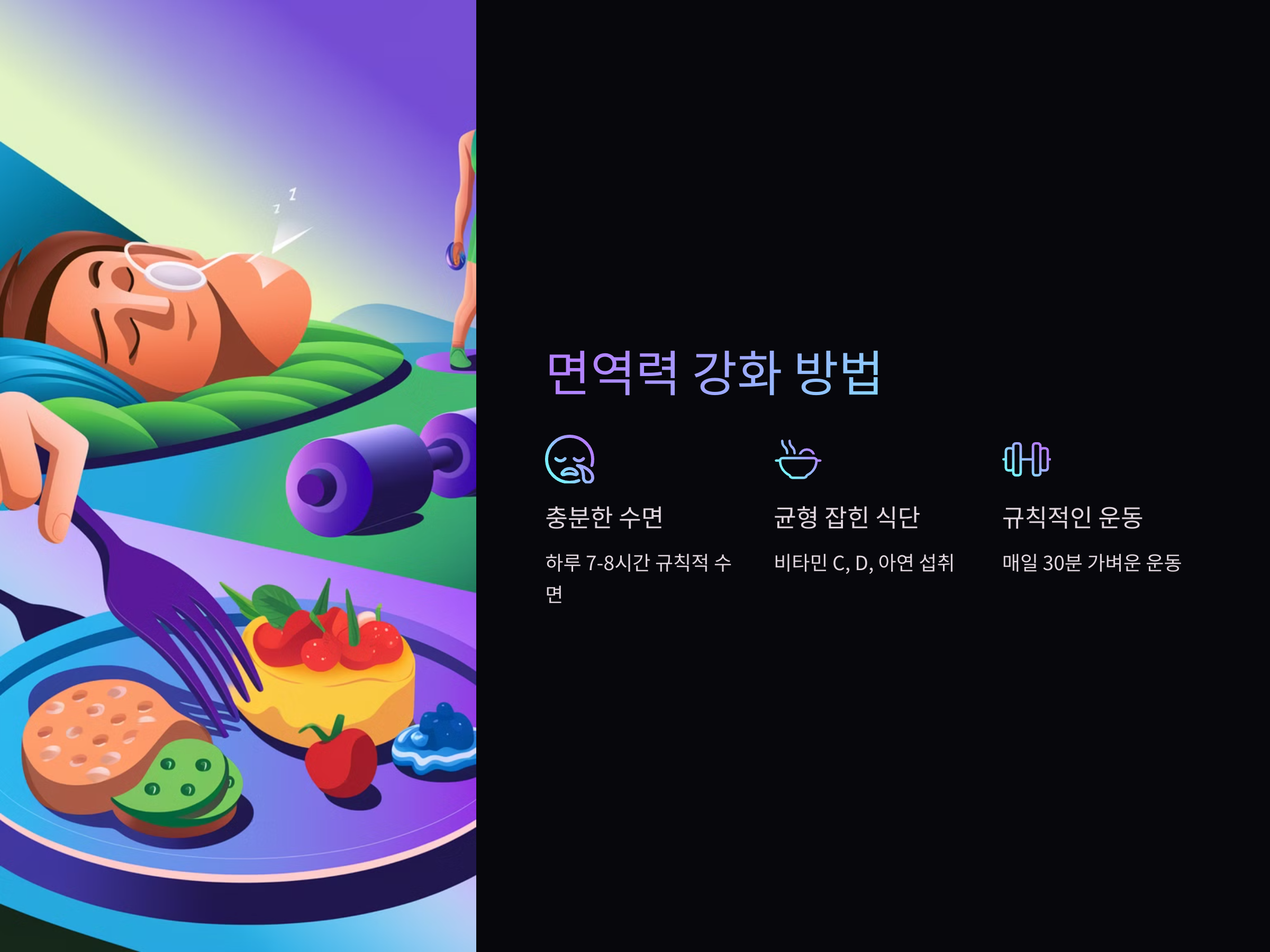 첫째, 충분한 수면을 취하는 것이 중요합니다. 수면은 면역 시스템을 활성화시키고, 몸이 회복하는 데 도움을 줍니다. 하루 7-8시간의 규칙적인 수면은 면역력 강화에 큰 역할을 합니다.