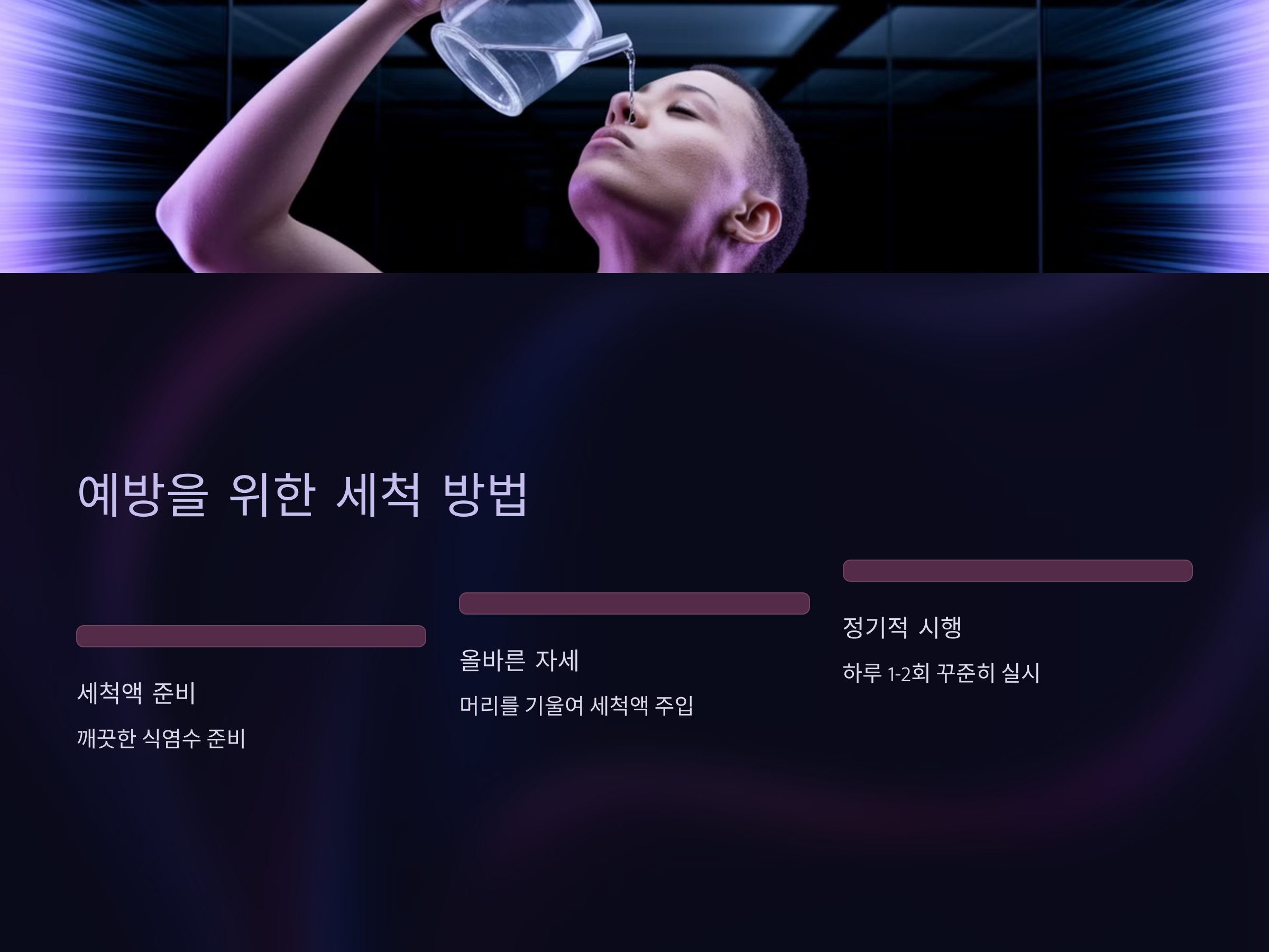 - 코 세척: 부비동 세척을 꾸준히 하여 비강을 청결하게 유지합니다.