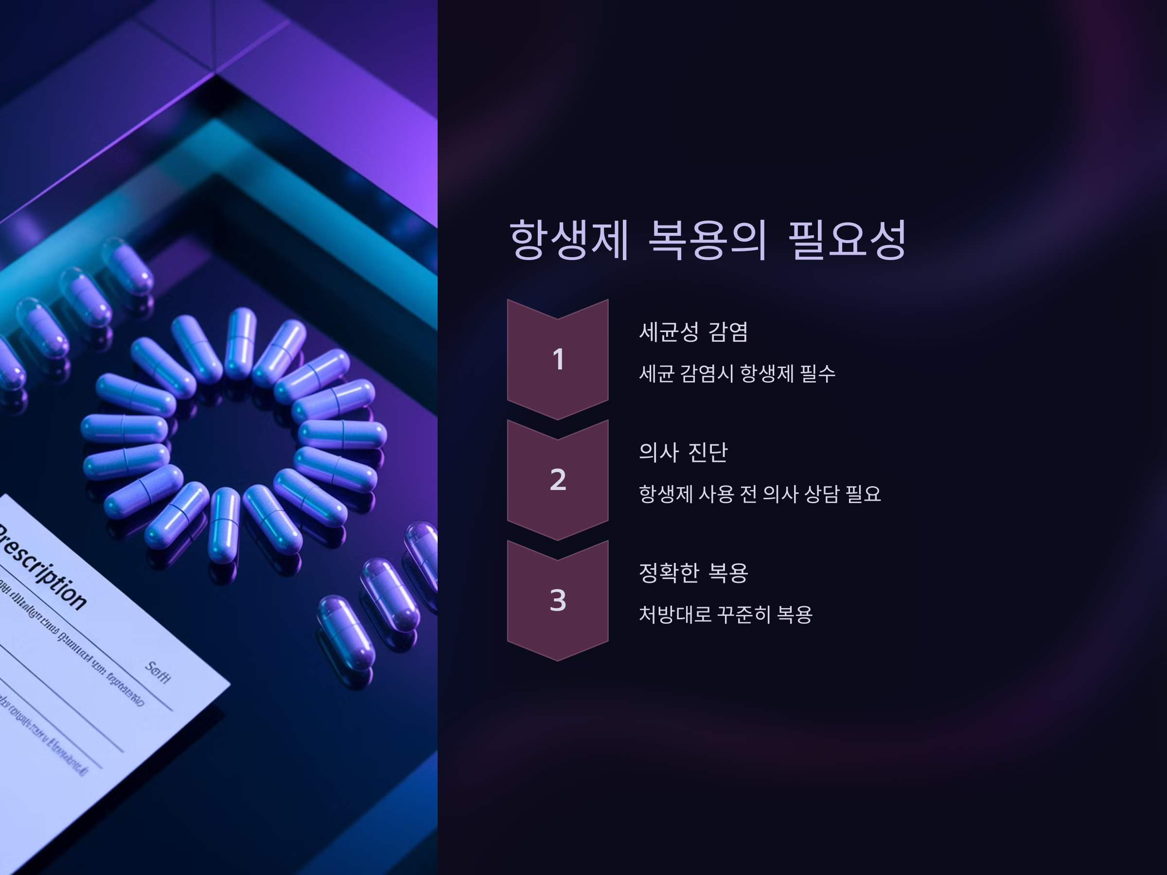 - 항생제 복용의 규칙성: 항생제를 복용할 때는 일정한 시간 간격을 두고 규칙적으로 복용하는 것이 중요합니다. 처방된 기간 동안 반드시 끝까지 복용해야 합니다.